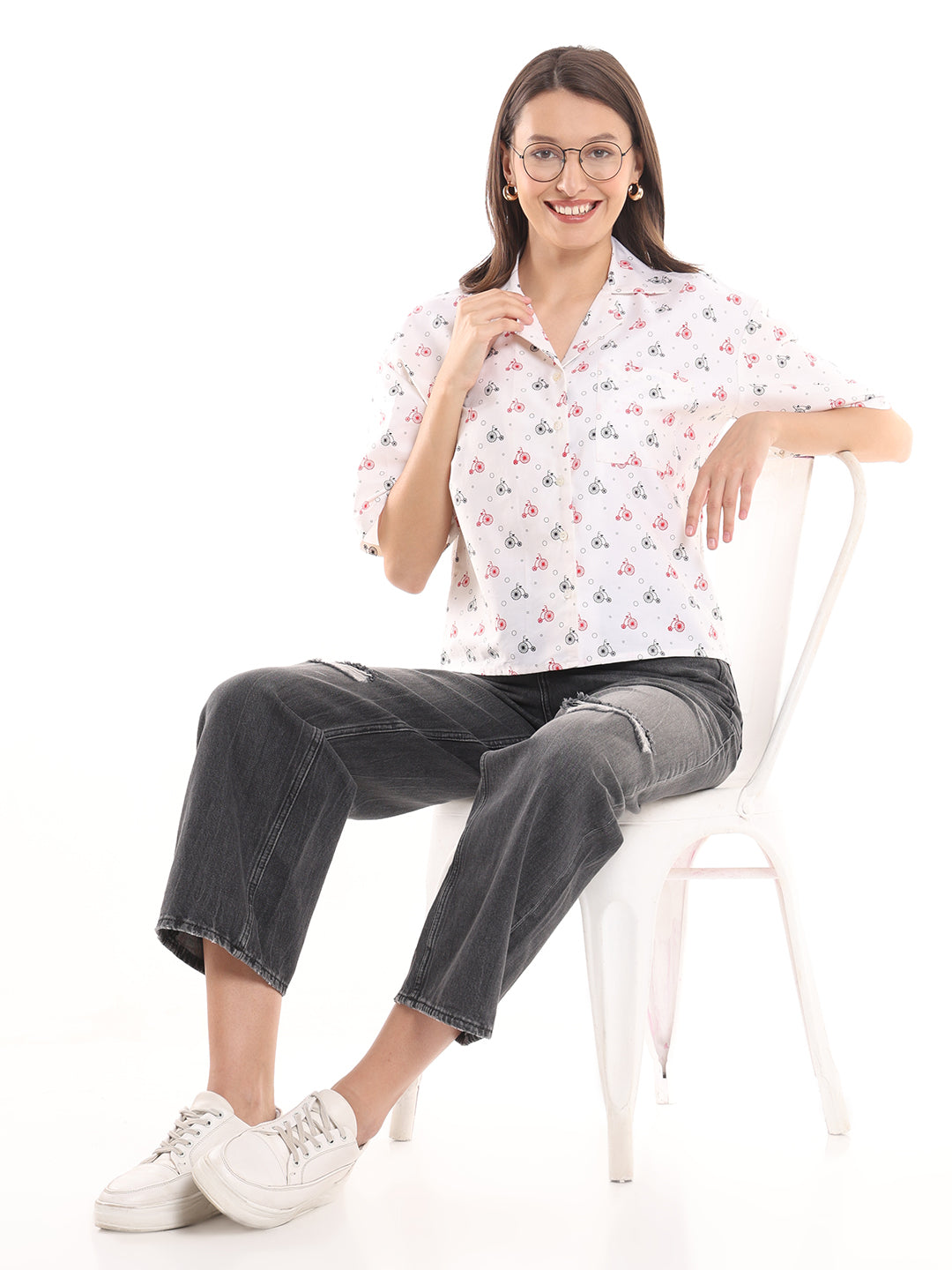 CECELIA WHITE PRINTED SHORT SLEEVES CROPPED COTTON SHIRT FOR WOMEN