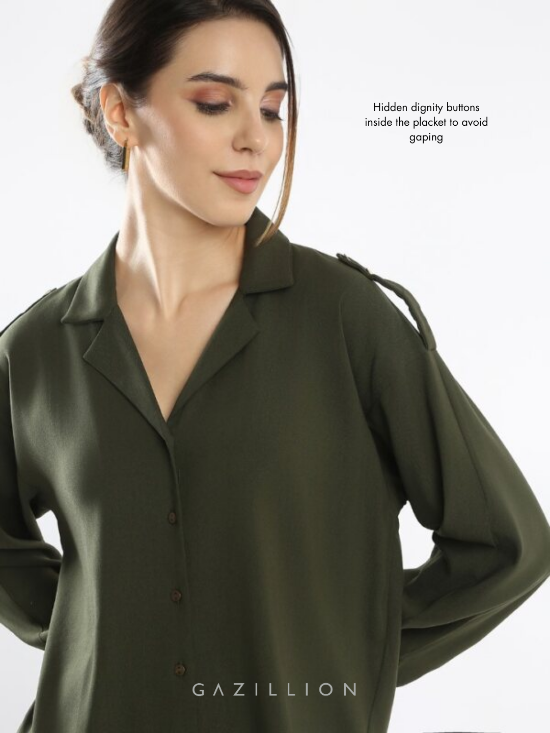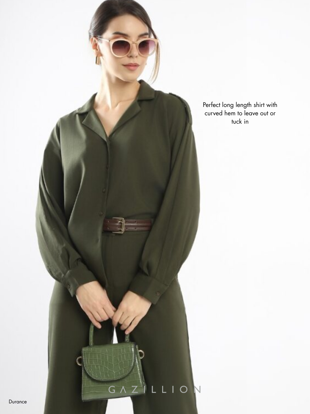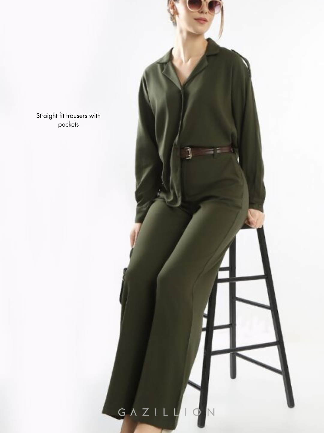 The Durance Co-Ord Set redefines office wear with its comfortable fit and timeless design. Featuring a plain, full-sleeve shirt paired with trousers, this stylish set is the perfect blend of fashion formals and workwear. When you wear this rich army green set. it gives you a polished and confident look.