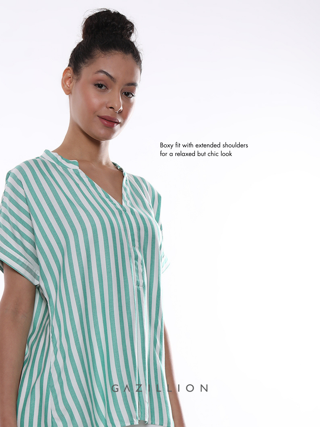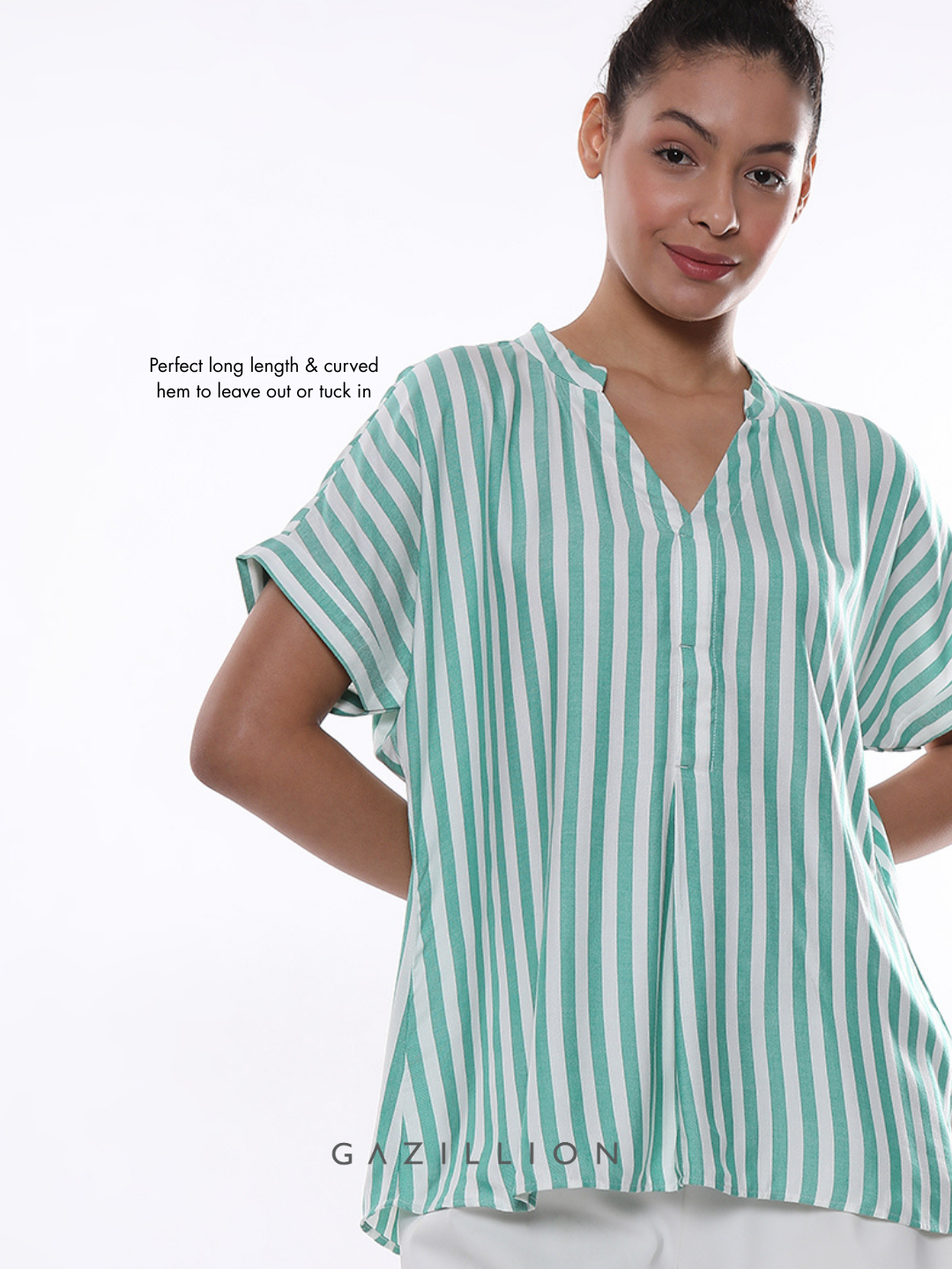 The Alva Green Striped Formal Top is stylish workwear at its best. Flattering for all sizes, it’s perfect for the office, combining elegance with all-day confidence.