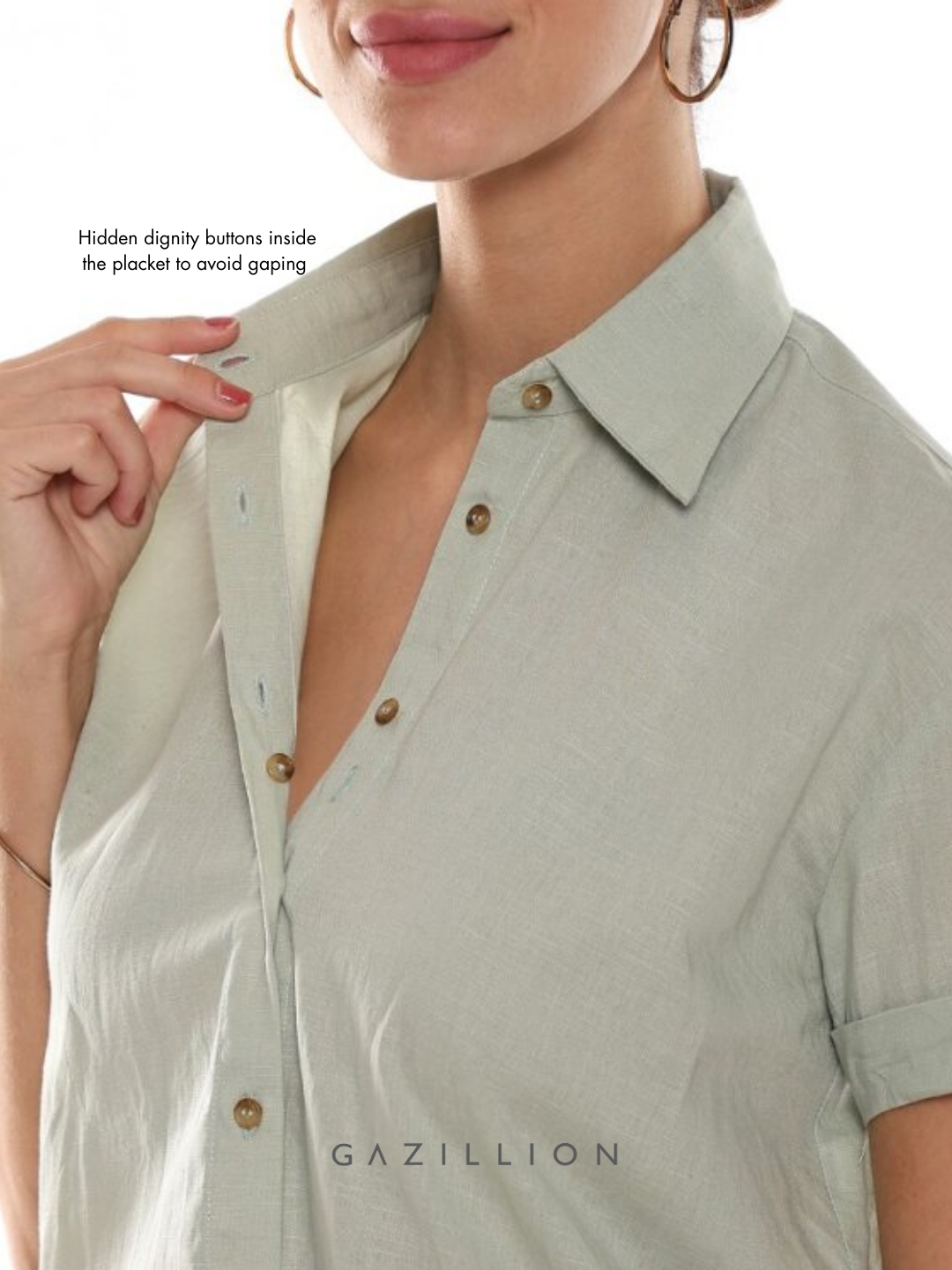 - Hidden dignity buttons inside the placket to avoid gaping