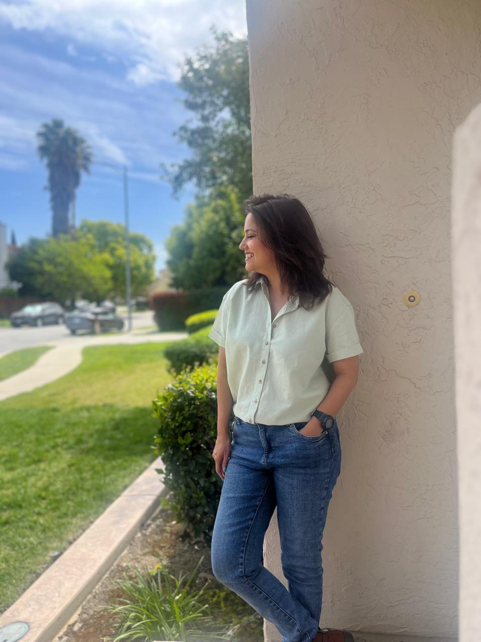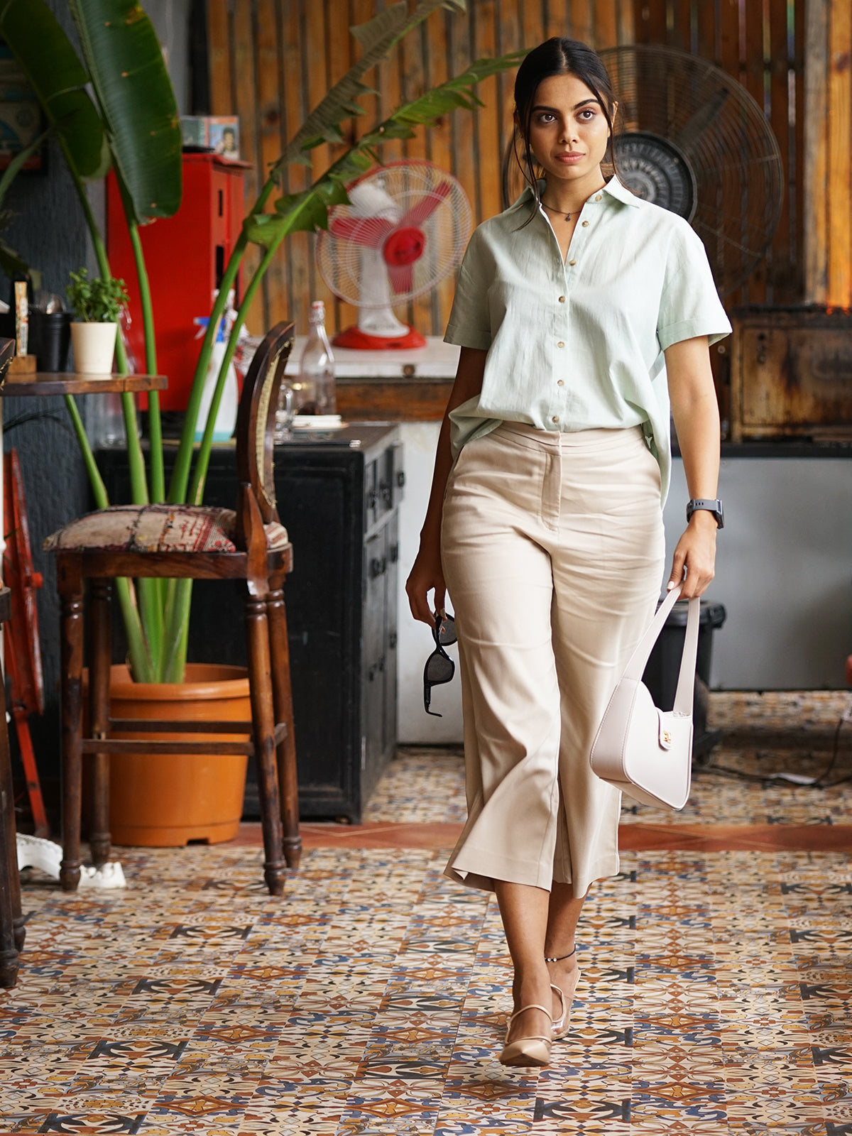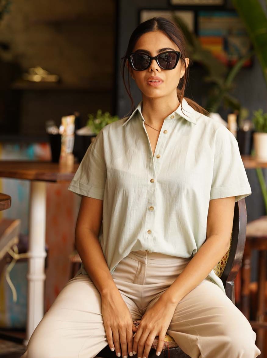The Ariana Cotton Shirt, is a formal half-sleeve shirt in soothing sage green, is designed for the modern office wardrobe, its crisp silhouette radiates confidence and effortless style, commanding attention with every move.
