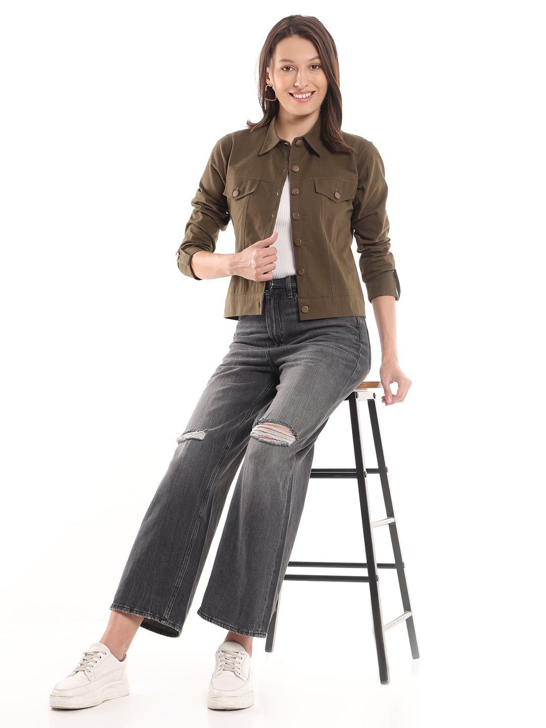 DANI OLIVE GREEN CROPPED LIGHT TRUCKER JACKET FOR WOMEN