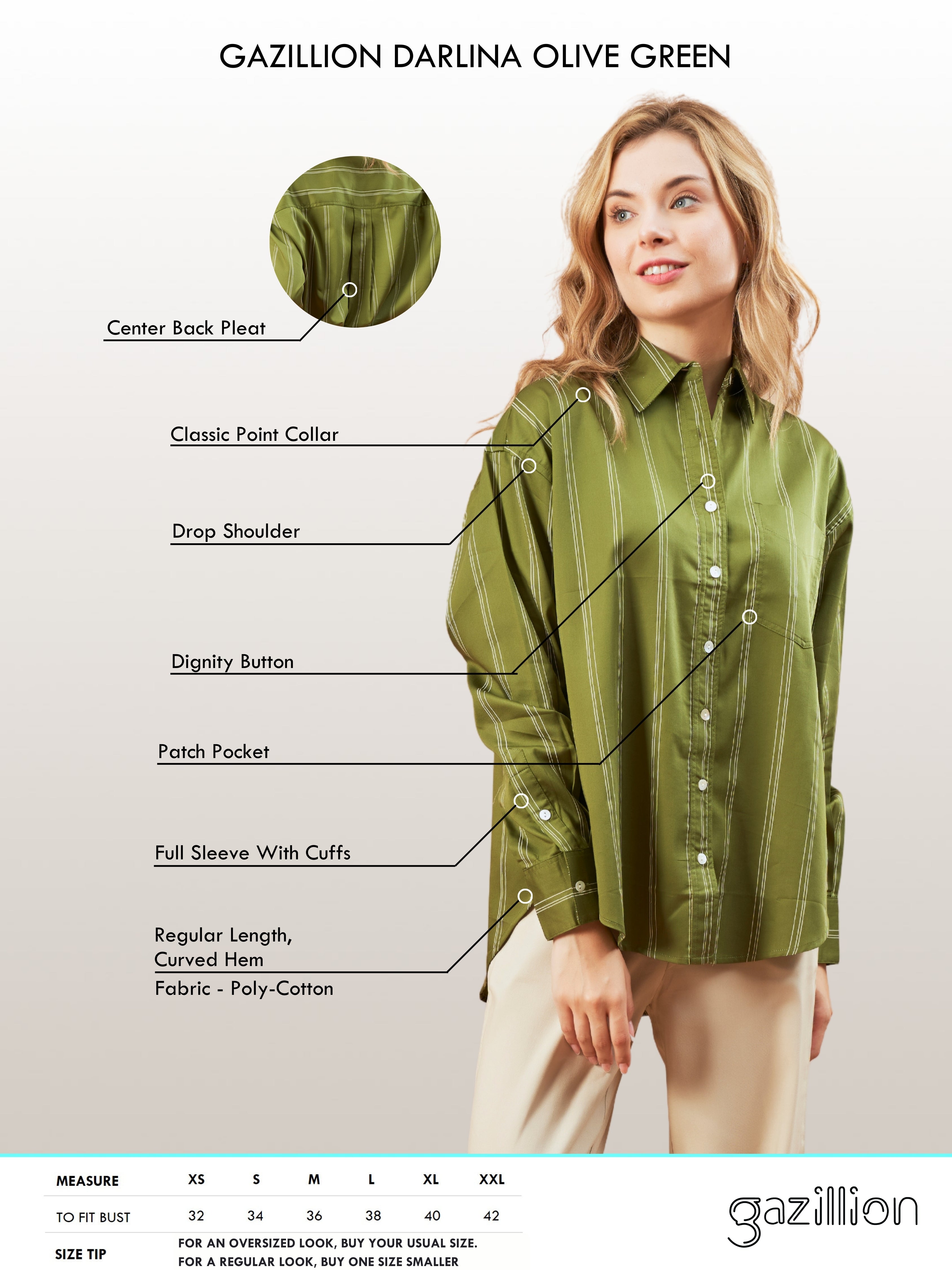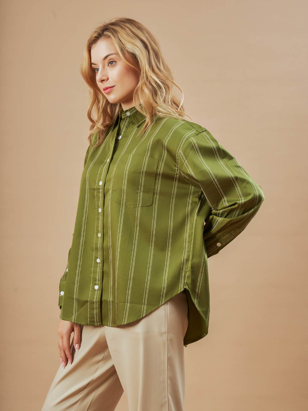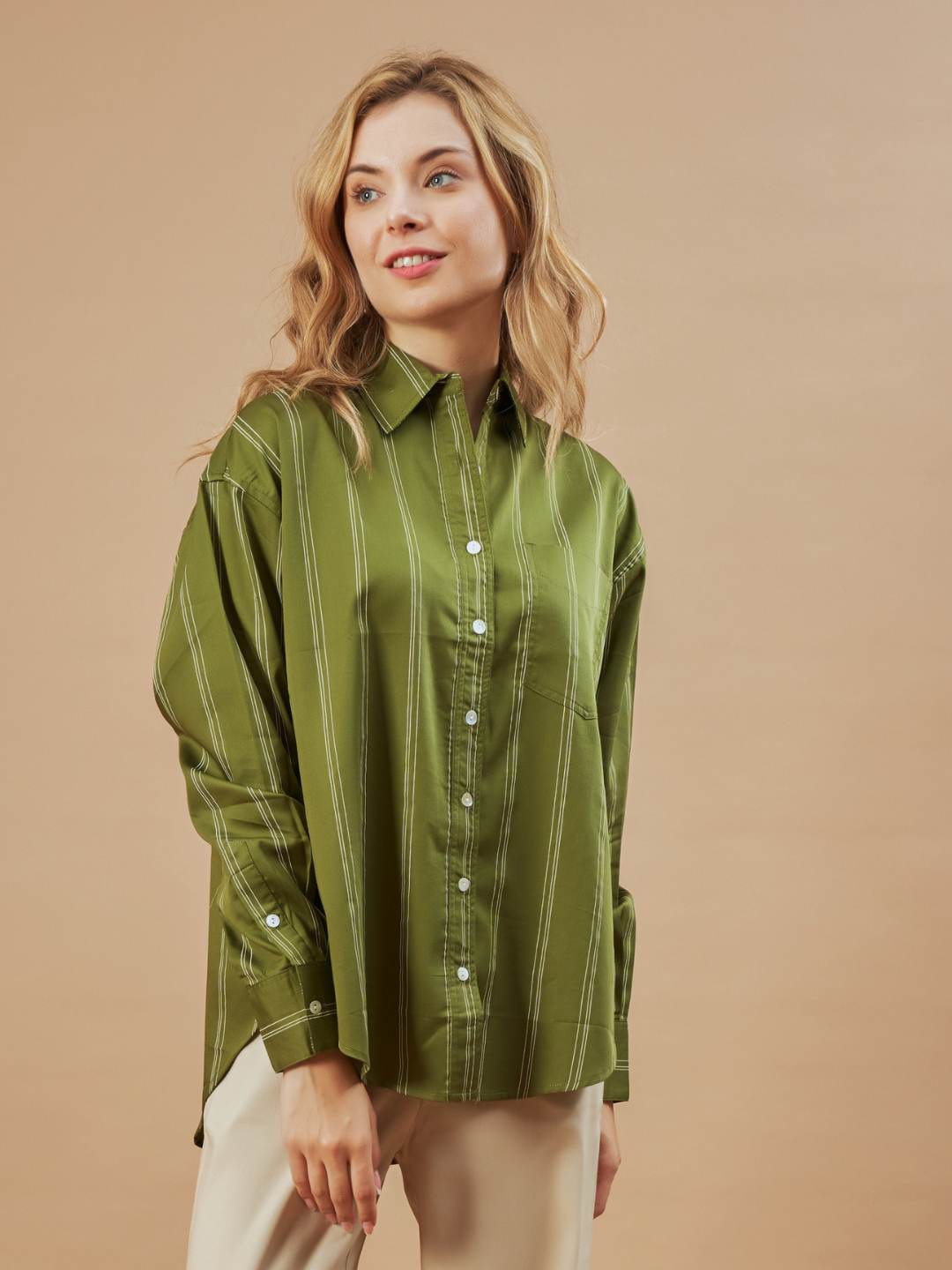 DARLINA OLIVE GREEN STRIPPED COTTON OVERSIZED SHIRT FOR WOMEN