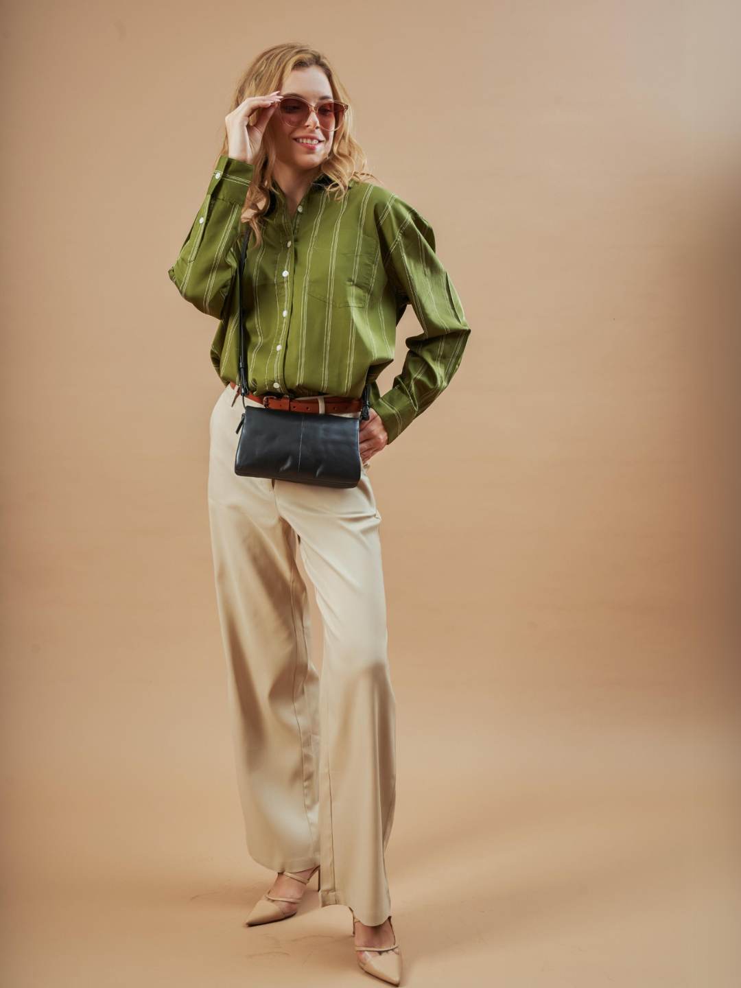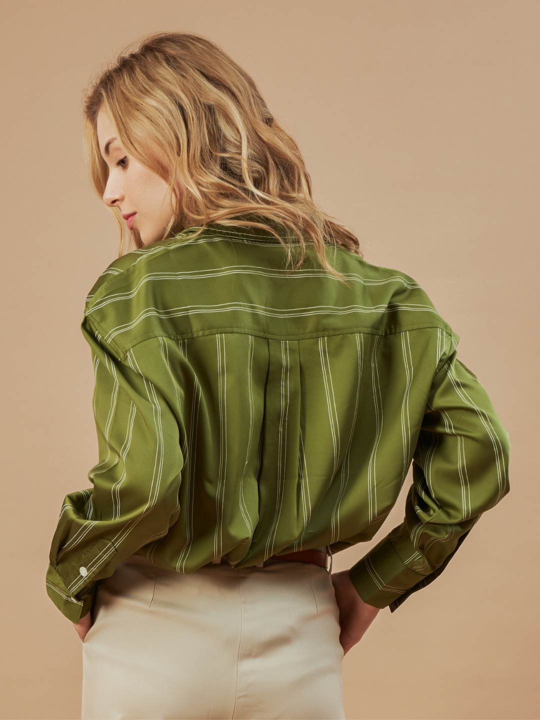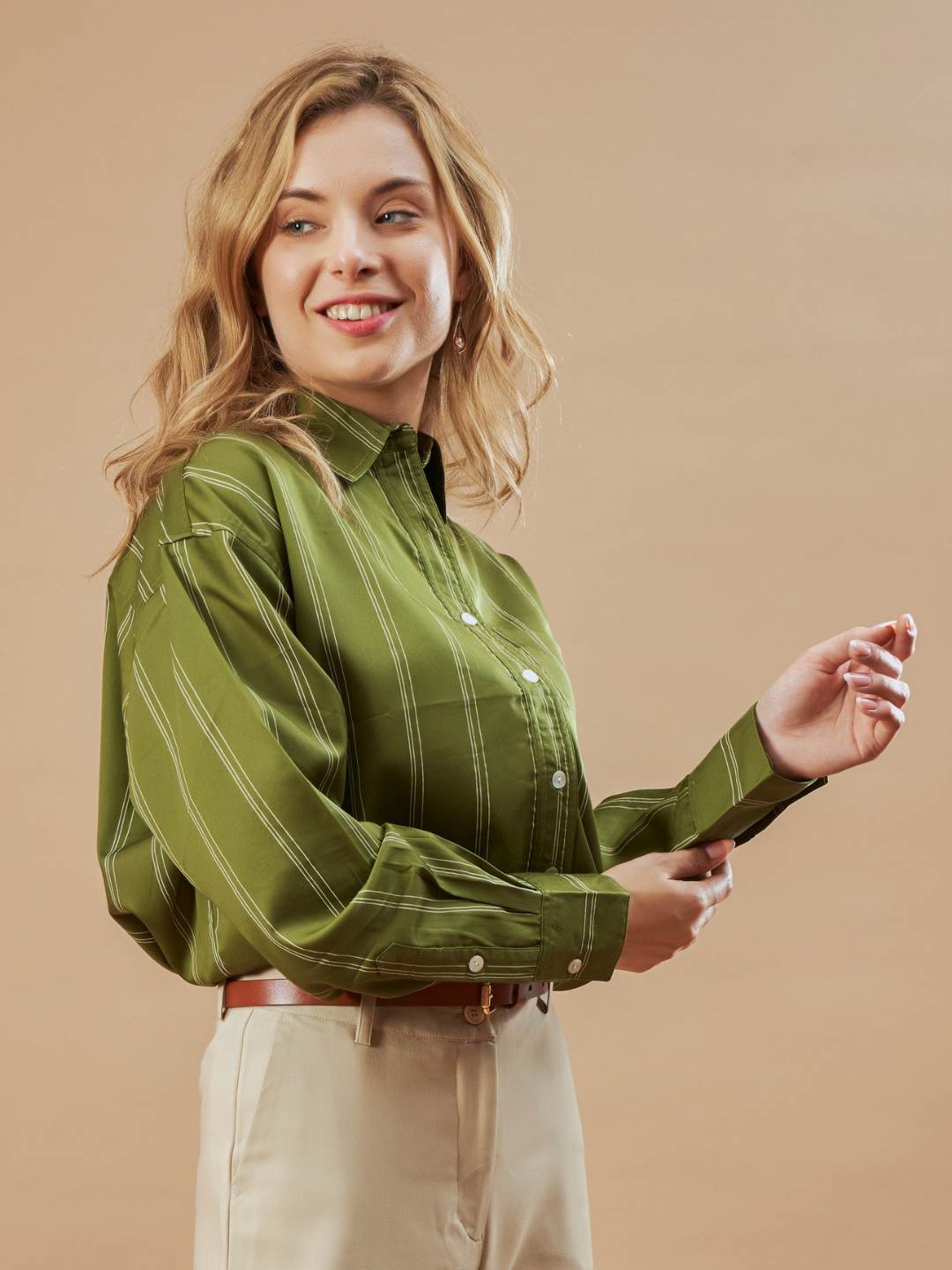 DARLINA OLIVE GREEN STRIPPED COTTON OVERSIZED SHIRT FOR WOMEN
