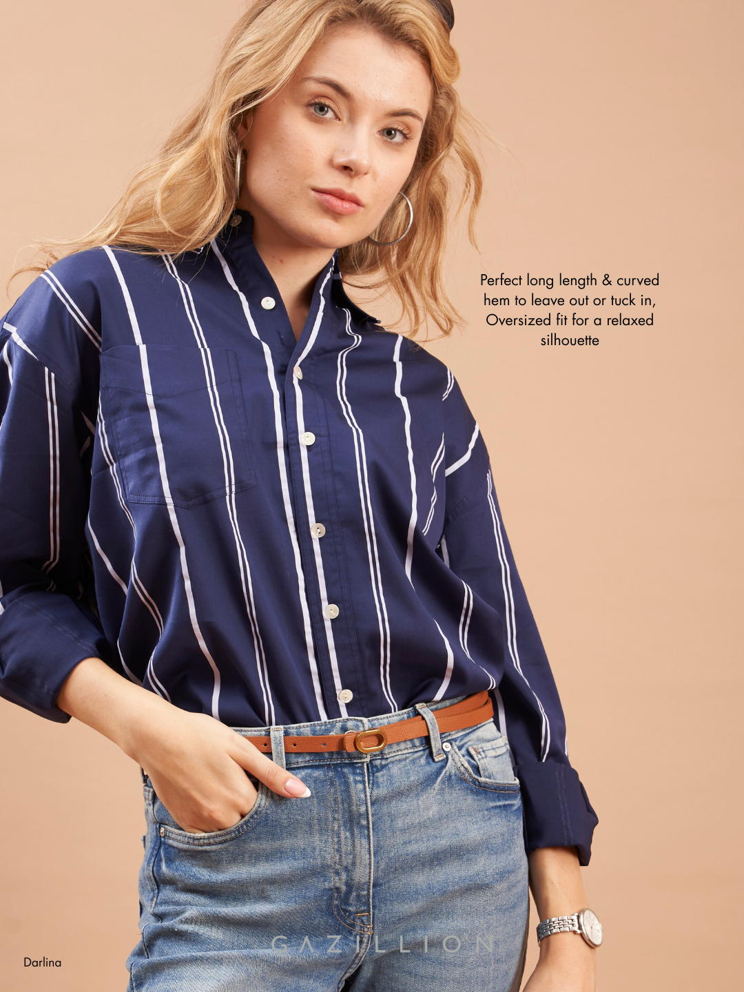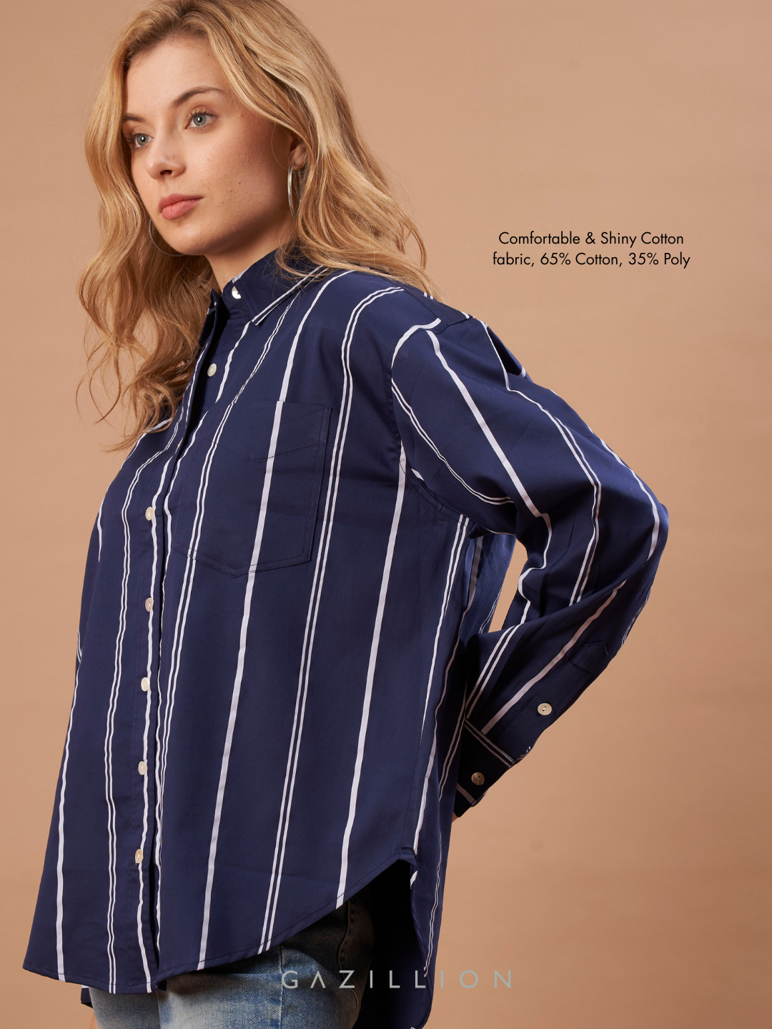 The Darlina Striped Cotton Oversized Shirt is elegant with its timeless stripes. The shirt brings a laid-back yet stylish edge to any casual look. The navy blue and white stripes create a harmonious blend, making this piece a standout addition to your wardrobe