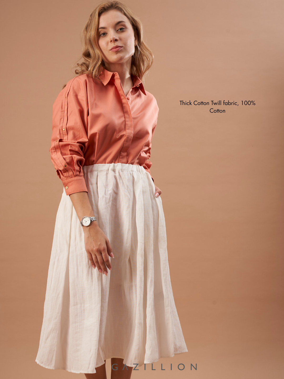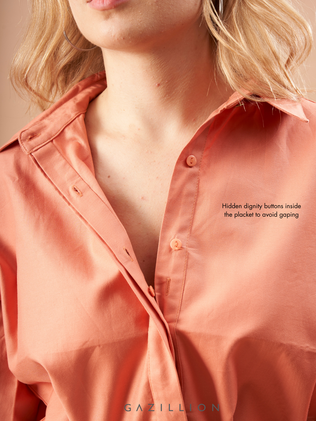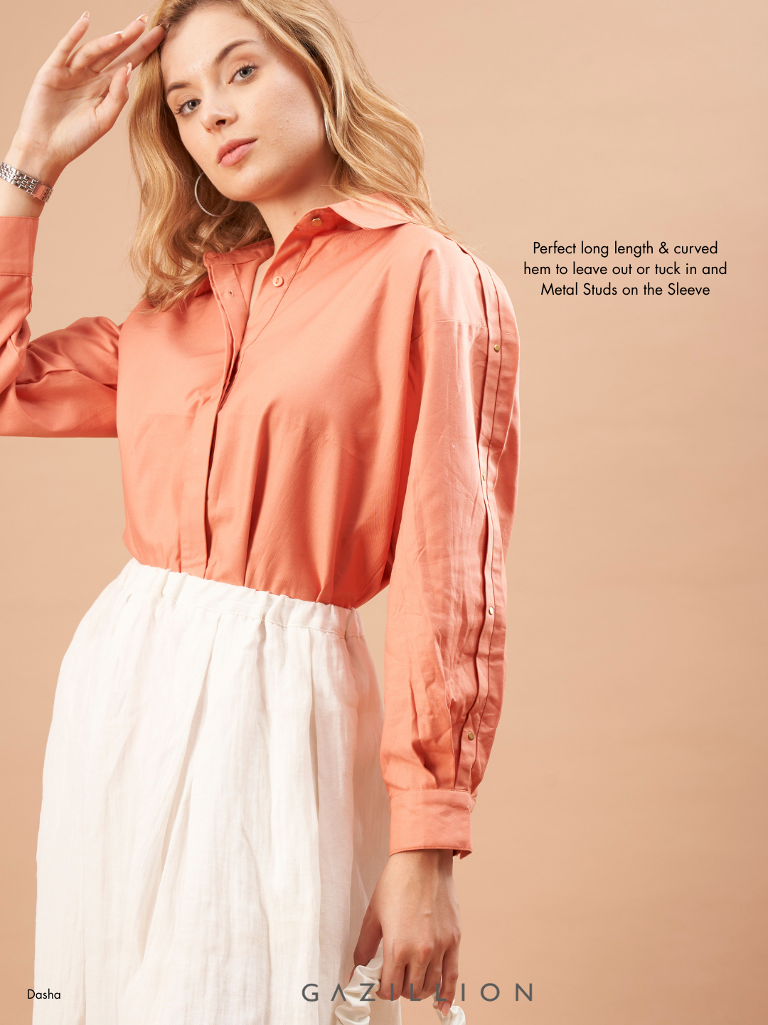 The Dasha Cotton Oversized Shirt brings together the perfect balance of casual comfort and edgy style. Made from soft cotton, this full-sleeve shirt features subtle metal studs that add a touch of modern flair to the delicate peach hue. - Effortless chic, versatile & fashion-forward looks.