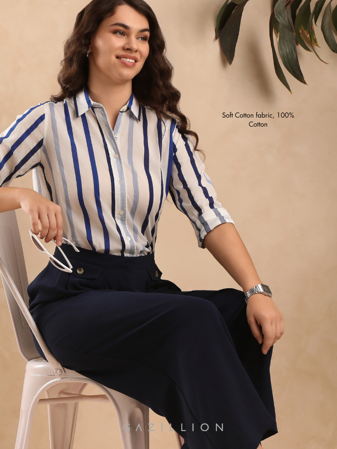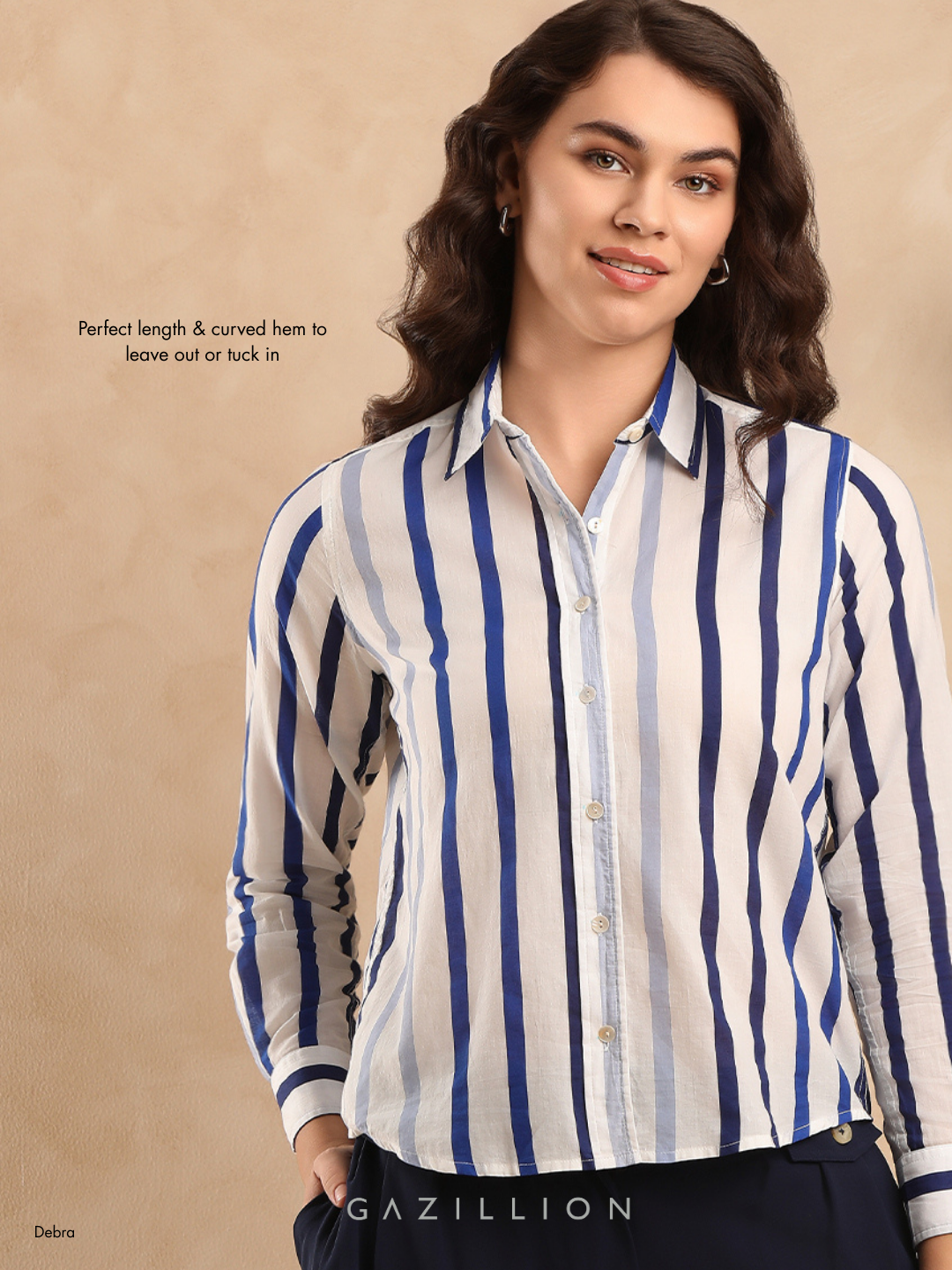 The Debra Striped Cotton Office Shirt is a statement piece for power dressing. Made from breathable cotton, its broad blue and white stripes exude confidence, while the full sleeves and relaxed fit ensure all-day comfort. A timeless choice for formal and workwear wardrobes.