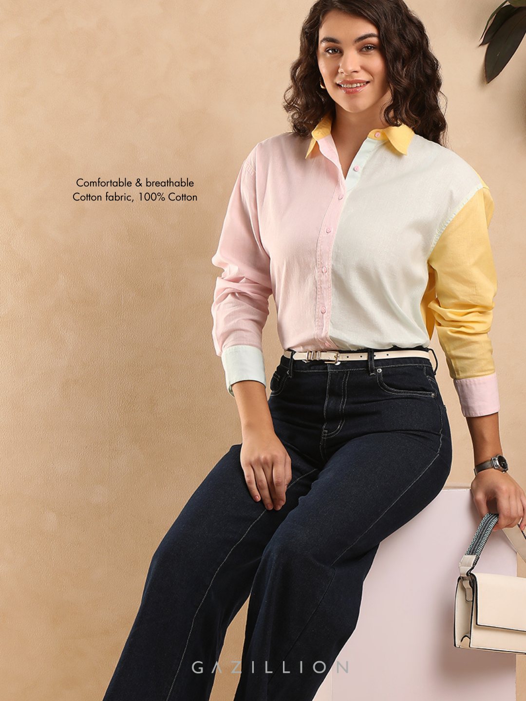 The Deera Pastel Colour Blocked Cotton Oversized Shirt blends candy and sugar colours for a playful yet stylish look. Made from soft cotton, this oversized fit shirt offers comfort with a fashion-forward edge, perfect for casual days.