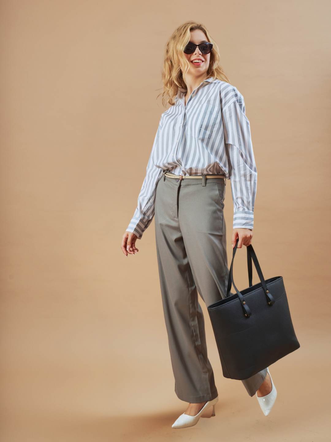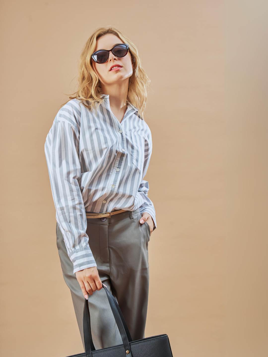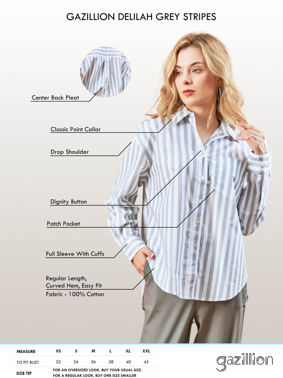 The Delilah Grey Striped Cotton Oversized Shirt combines casual comfort with stylish formal stripes. Featuring grey and white stripes this oversized fit shirt offers effortless chic style, making it the perfect piece for laid-back yet fashionable days work days.