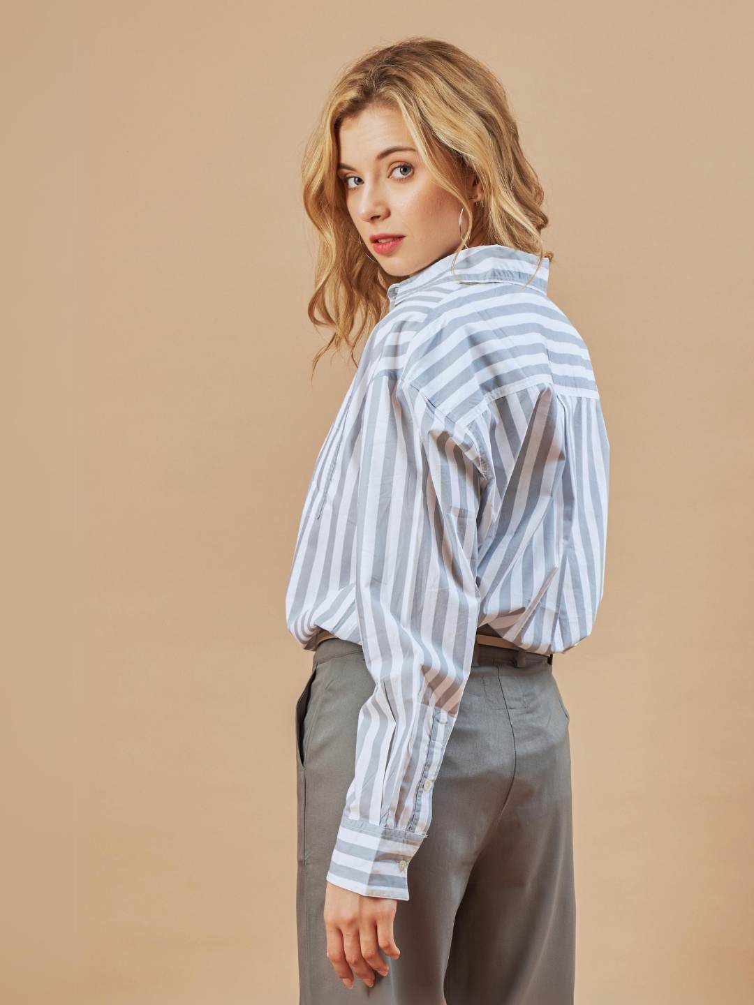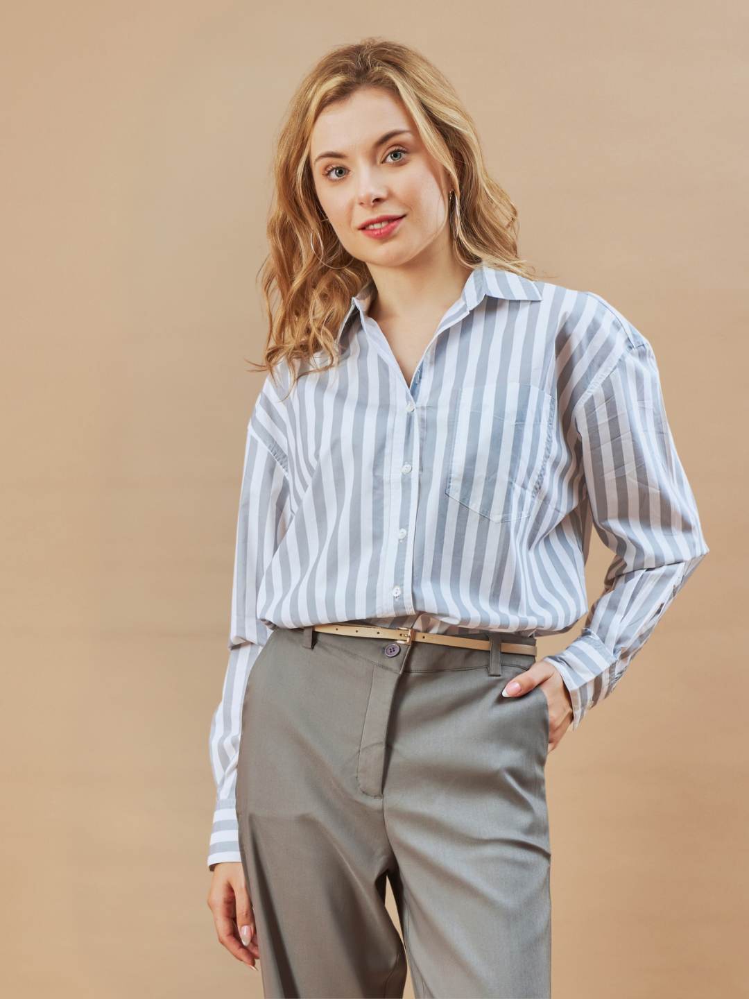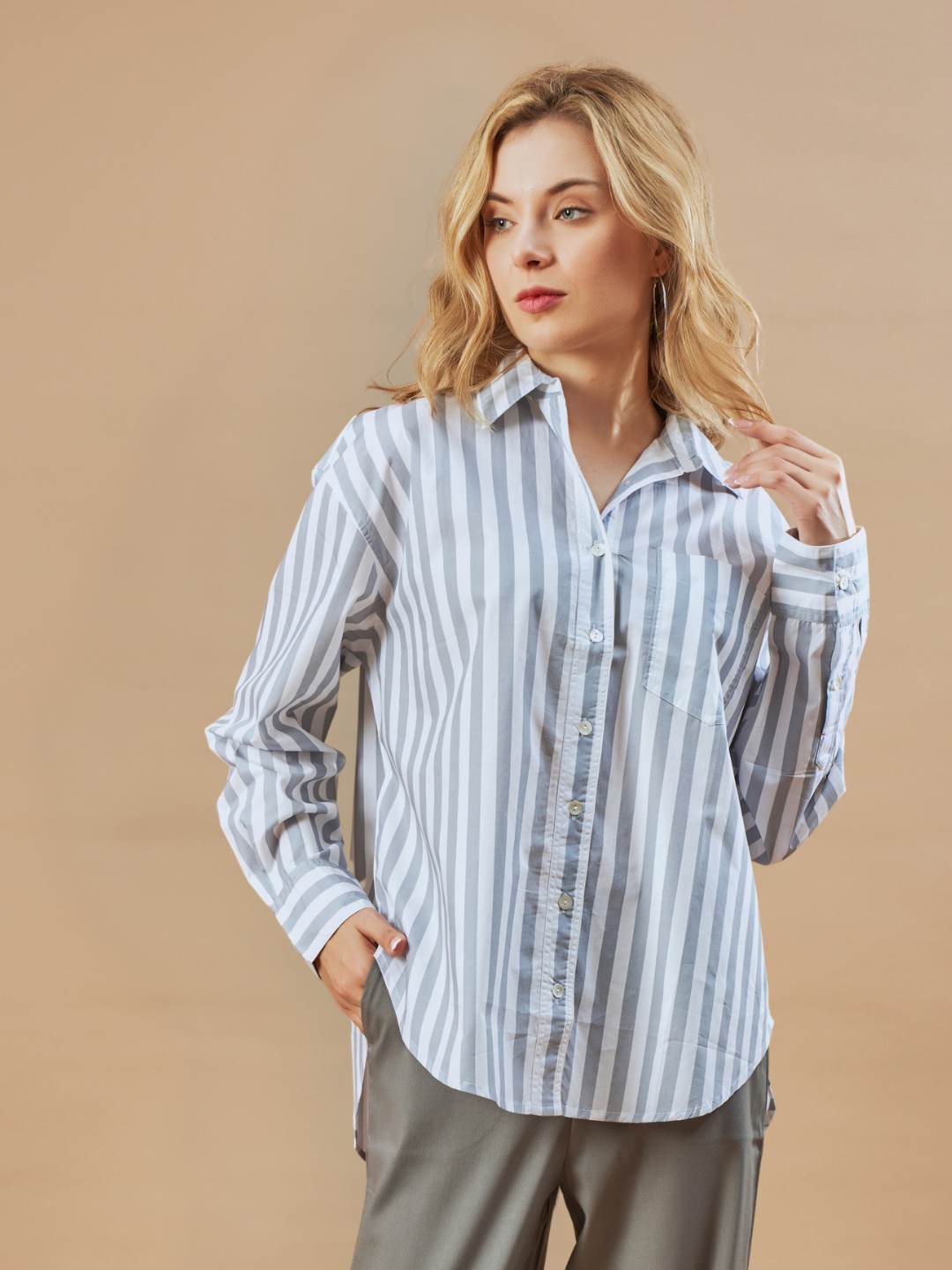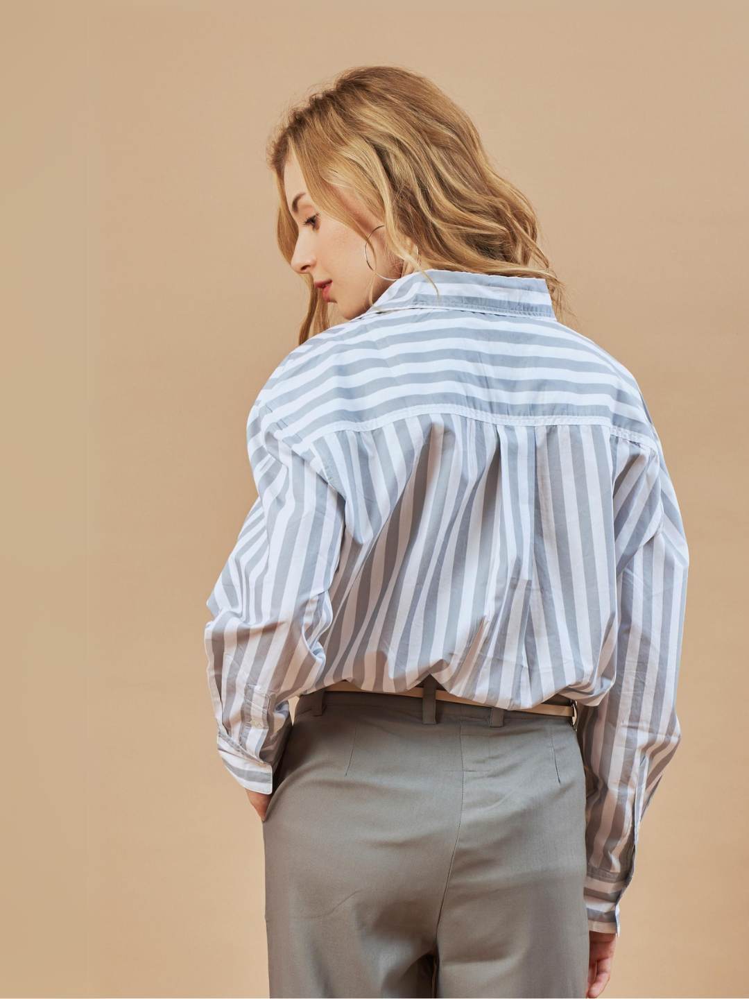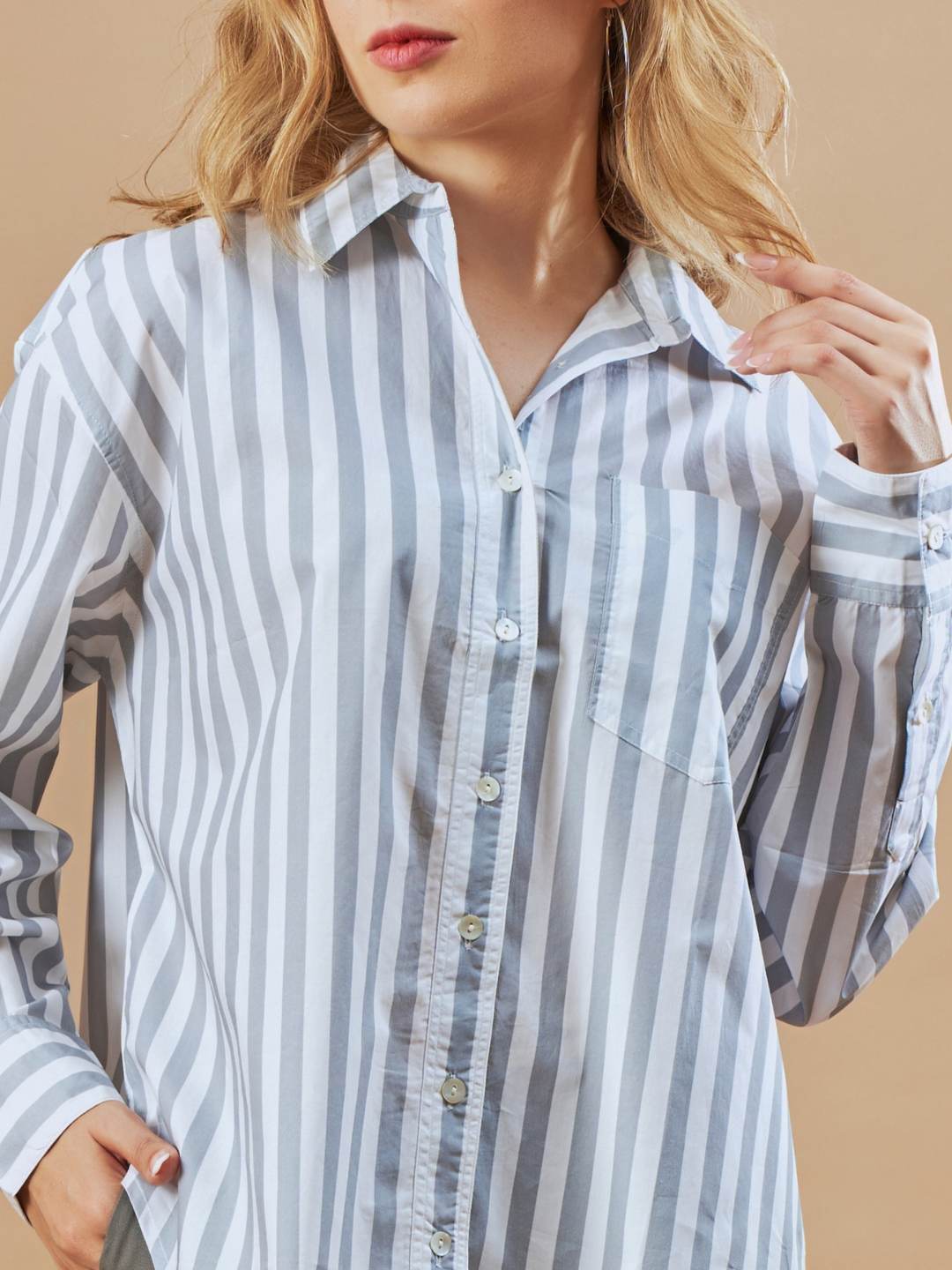 DELILAH GREY STRIPPED COTTON OVERSIZED SHIRT FOR WOMEN