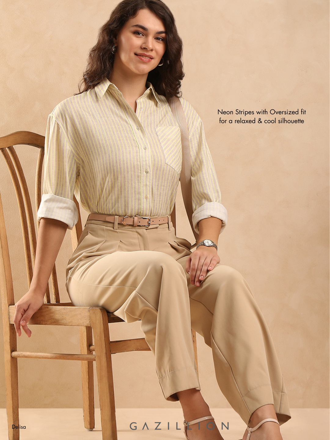The Delisa Neon Green Striped Cotton Oversized Shirt combines casual comfort with stylish formal stripes. Featuring neon stripes this oversized fit shirt offers effortless chic style, making it the perfect piece for laid-back yet fashionable days and workdays.
