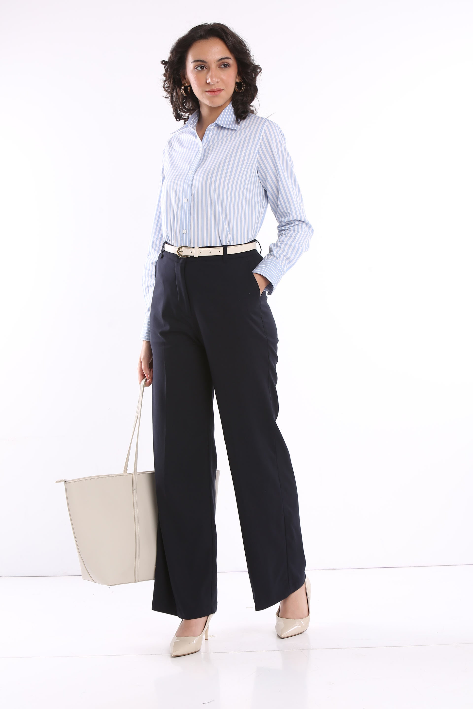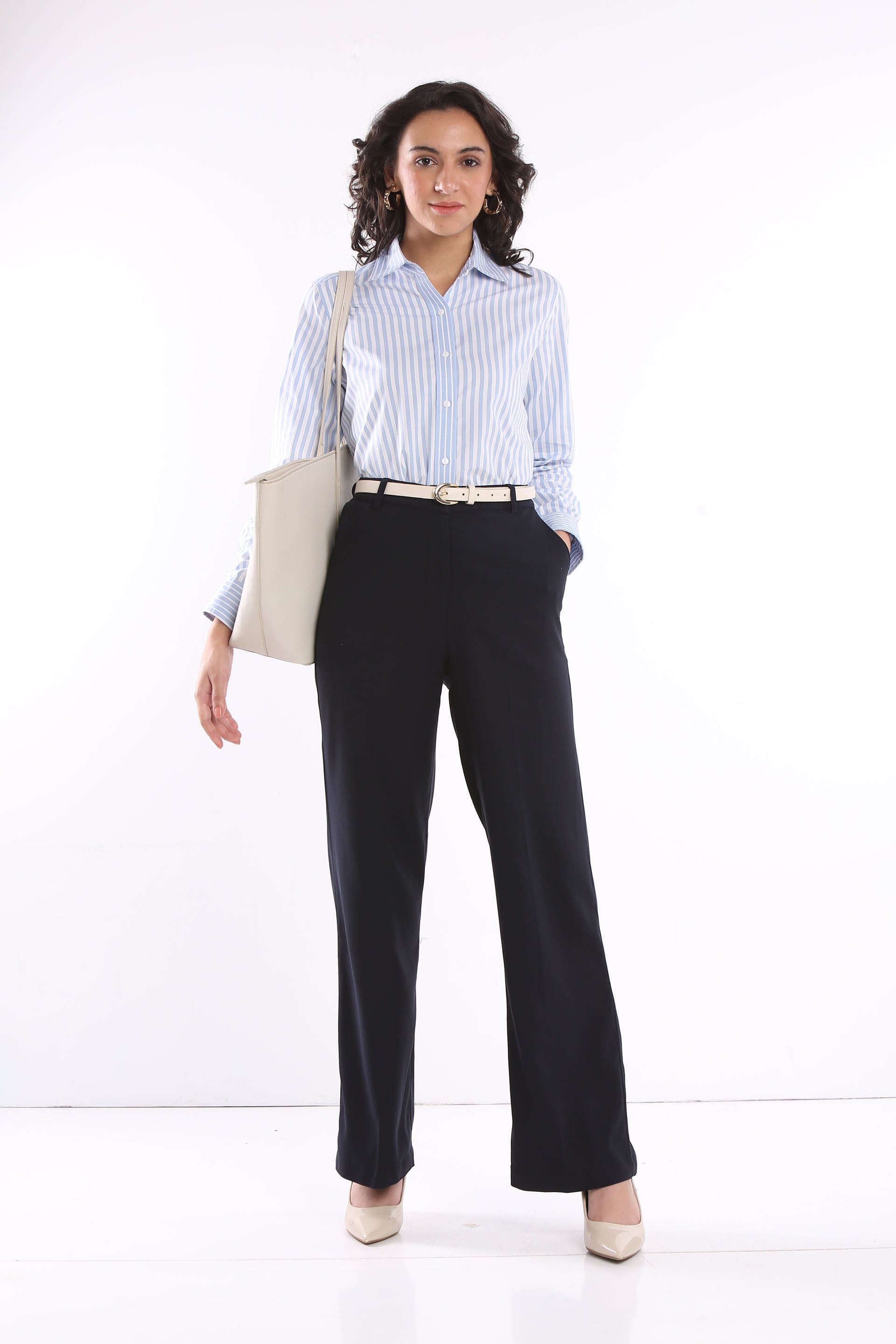 The Diane Navy Blue Formal Trousers, high-waisted and straight-fit, are a timeless addition to your office wardrobe. Designed for comfort and elegance, they move effortlessly with you, making sure you look poised and confident with every step.