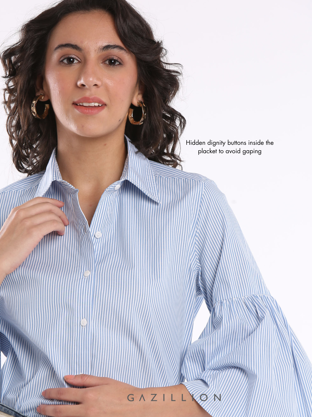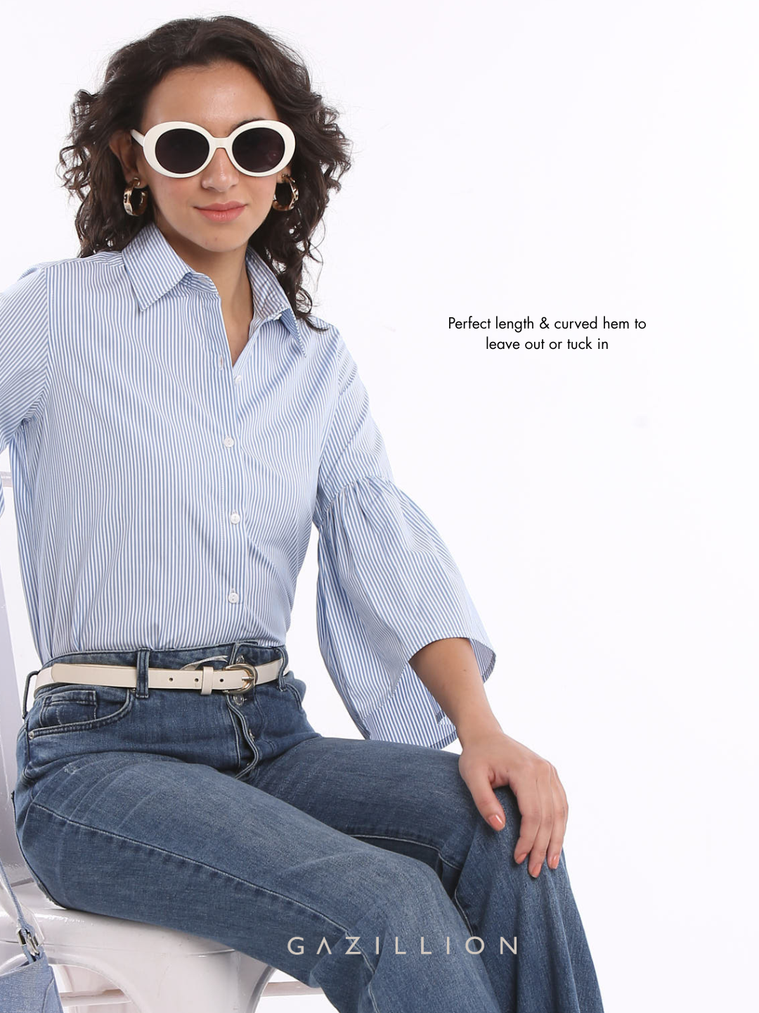 The Bell Cuff of the Erica shirt is the most beautiful detail that makes this shirt a perfectly stylish formal shirt. The blue and white striped shirt is apt to be worn to work, at our out of office. Wear it formally with pants or trousers or casually with jeans, either way it will look lovely on you.