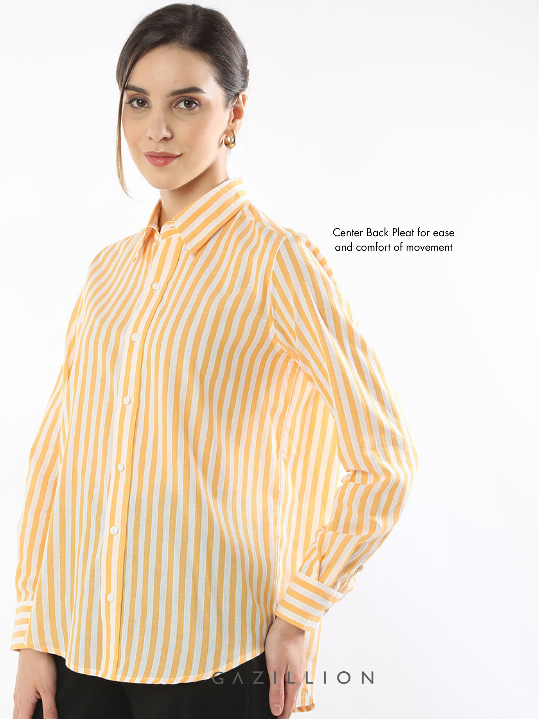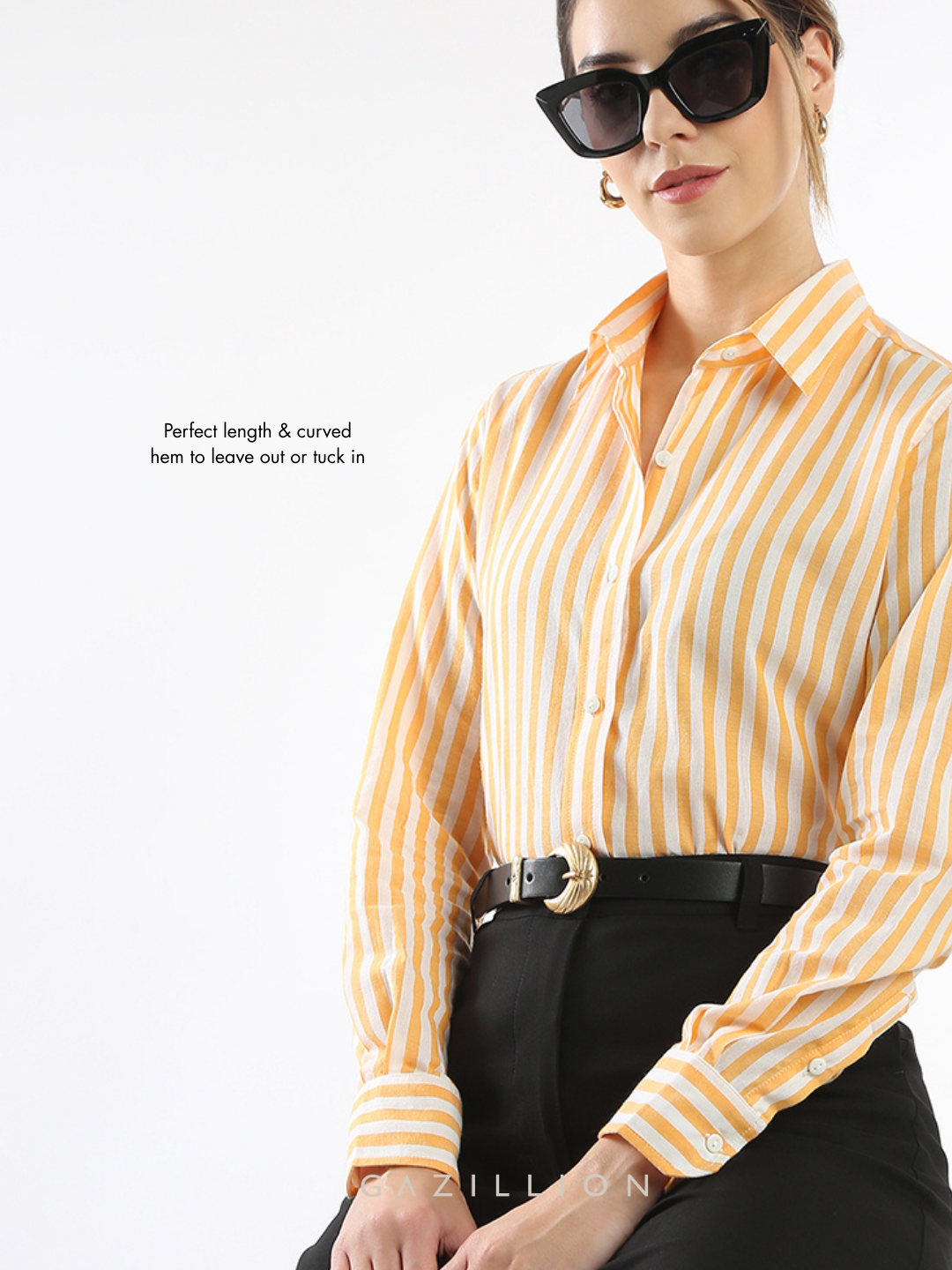 The Eva Yellow Striped Cotton Formal Shirt combines office-wear comfort with style. Made from soft cotton, it features a relaxed fit offering both, ease and sophistication. The yellow stripes add a touch of elegance, making it a perfect choice for workwear or formal occasions.
