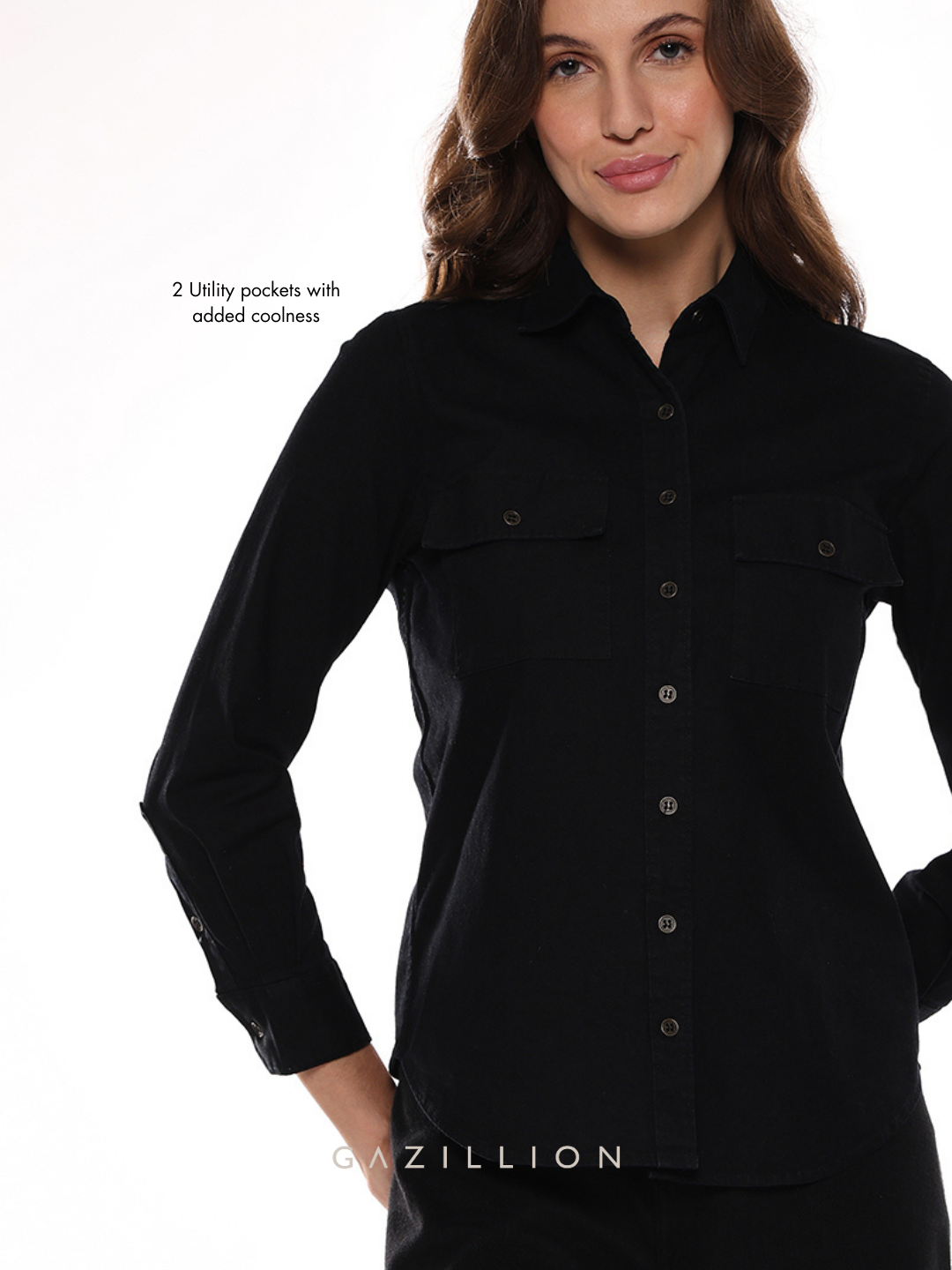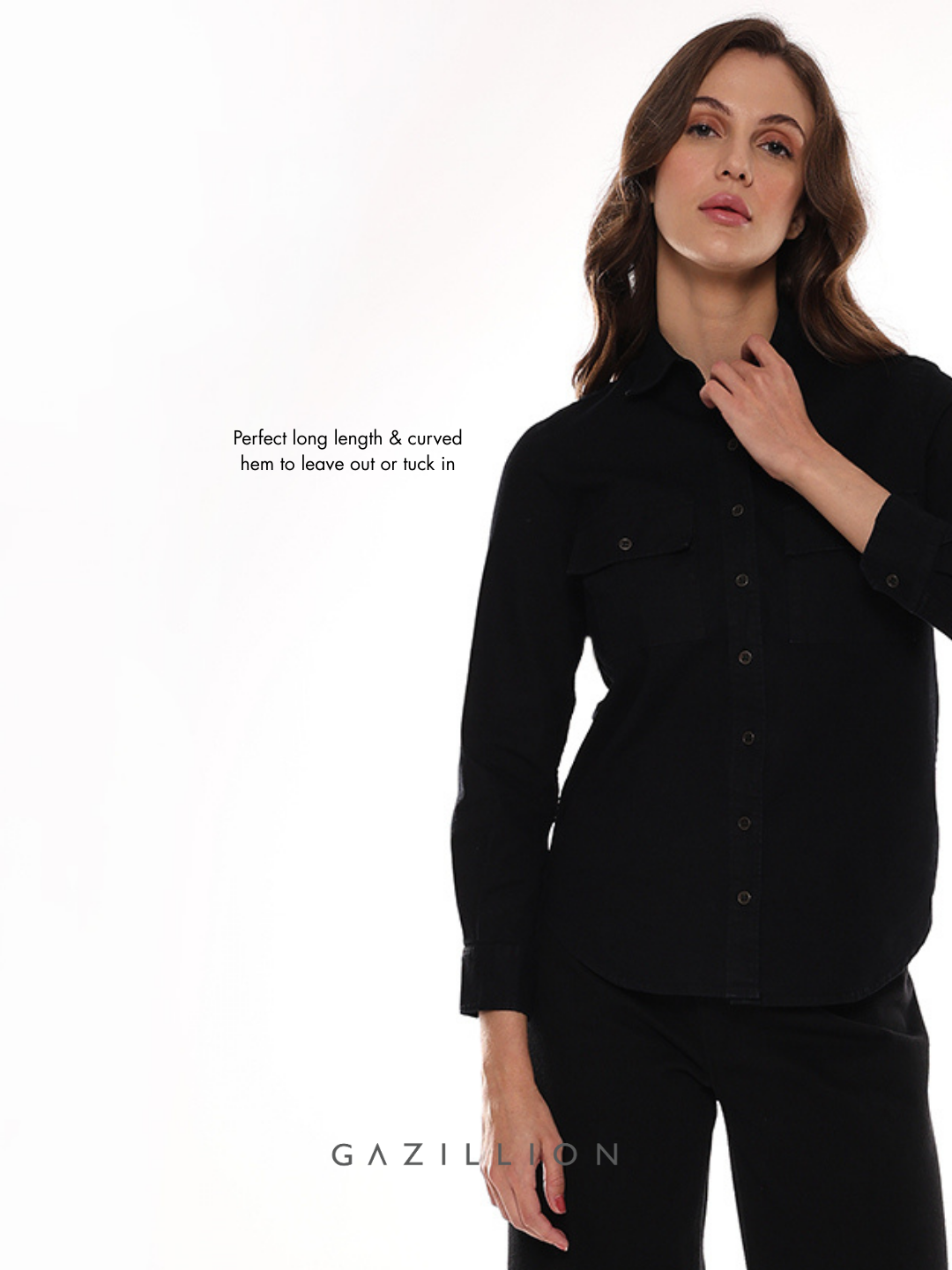 The Allaya Denim Shirt, is a classic women's utility shirt in black denim, that will never go out of style. When you wear it, you feel the change of force in your stride, you are ready to be noticed.