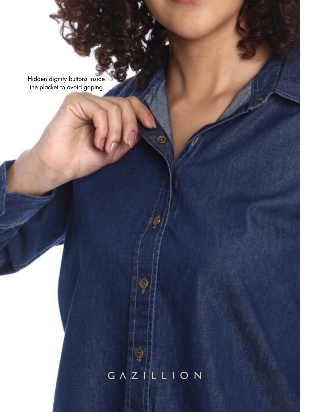 - Hidden dignity buttons inside the placket to avoid gaping