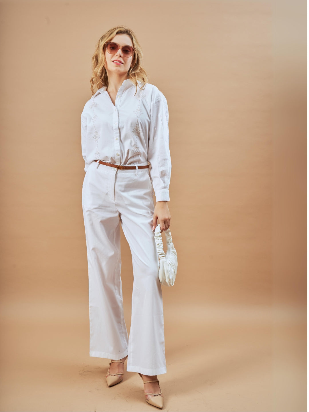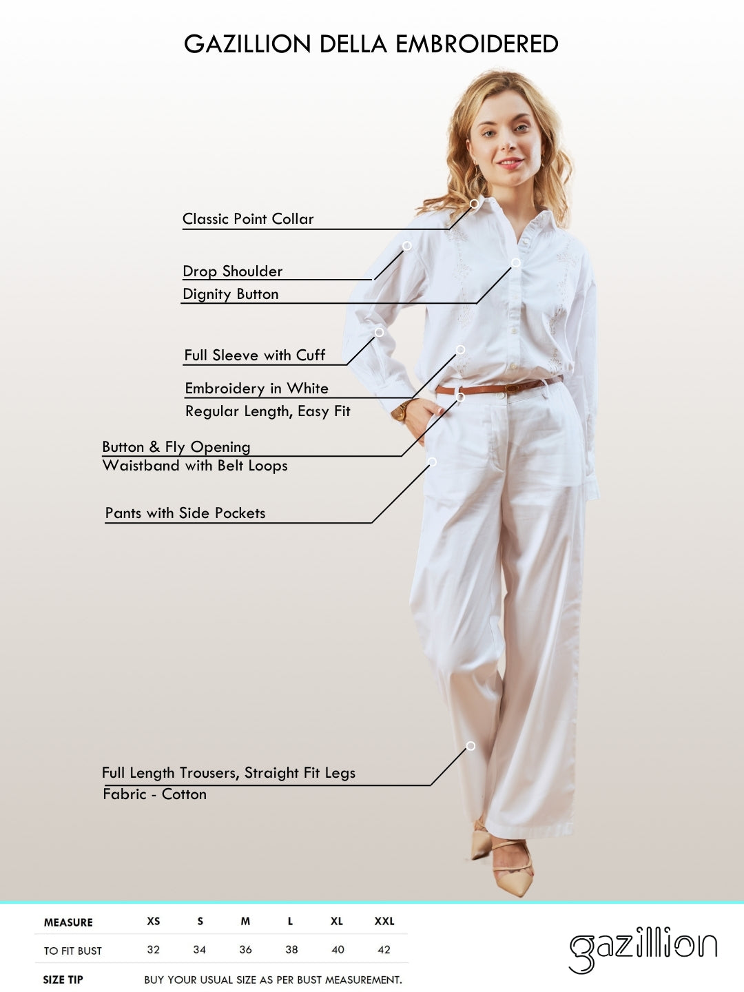The Della White Embroidered Co-Ord Set redefines office wear with its comfortable fit and timeless design. Featuring a delicate floral embroidered shirt paired with trousers, this stylish set is the perfect blend of fashion formals and workwear.