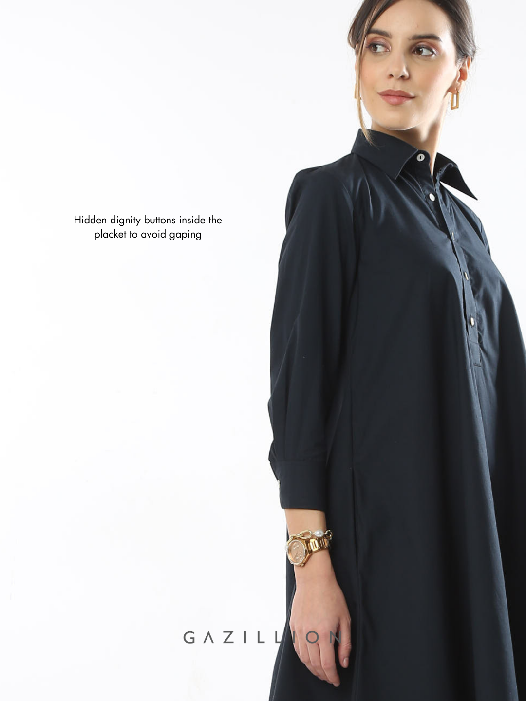 The Elinda Black Cotton Formal Midi Dress is your go-to choice for the perfect work-wear or formal wear dress. You can wear this comfortable cotton dress all day long with complete ease. You can style it up with a belt or keep it loose and breezy for an activity-packed day at your office.