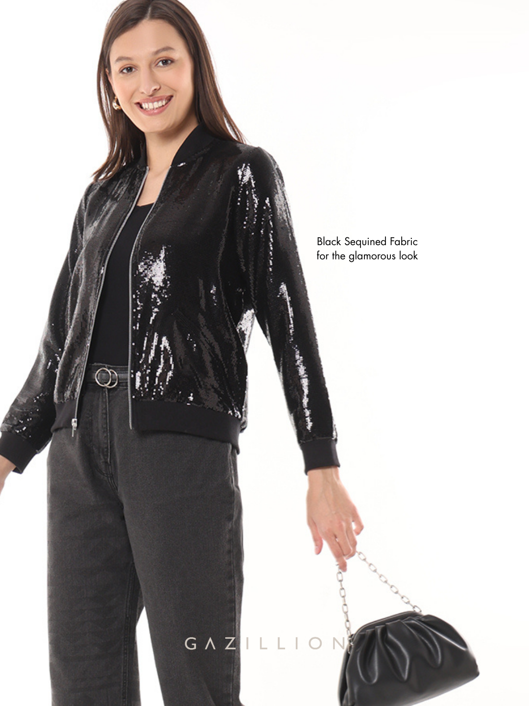 The Elsie Black Sequined Cropped Bomber Jacket combines party-ready glam with effortless style. Featuring shimmering sequins and a ribbed hem, this chic cropped jacket is perfect for parties or office parties. When you wear it, you carry an air of bold sophistication that’s hard to miss.