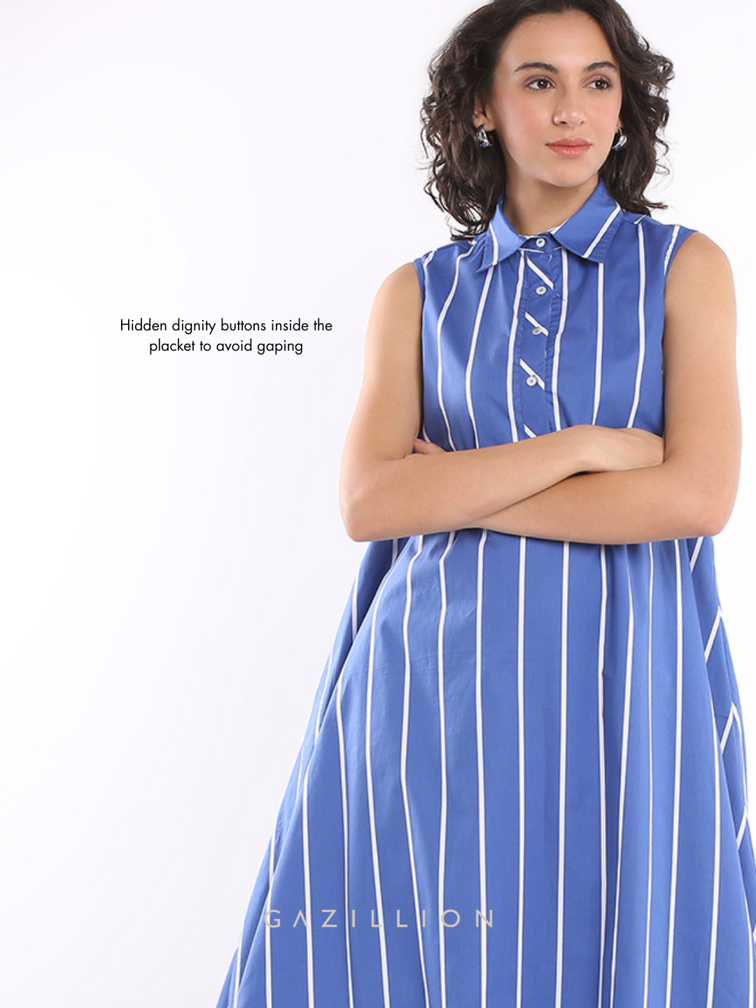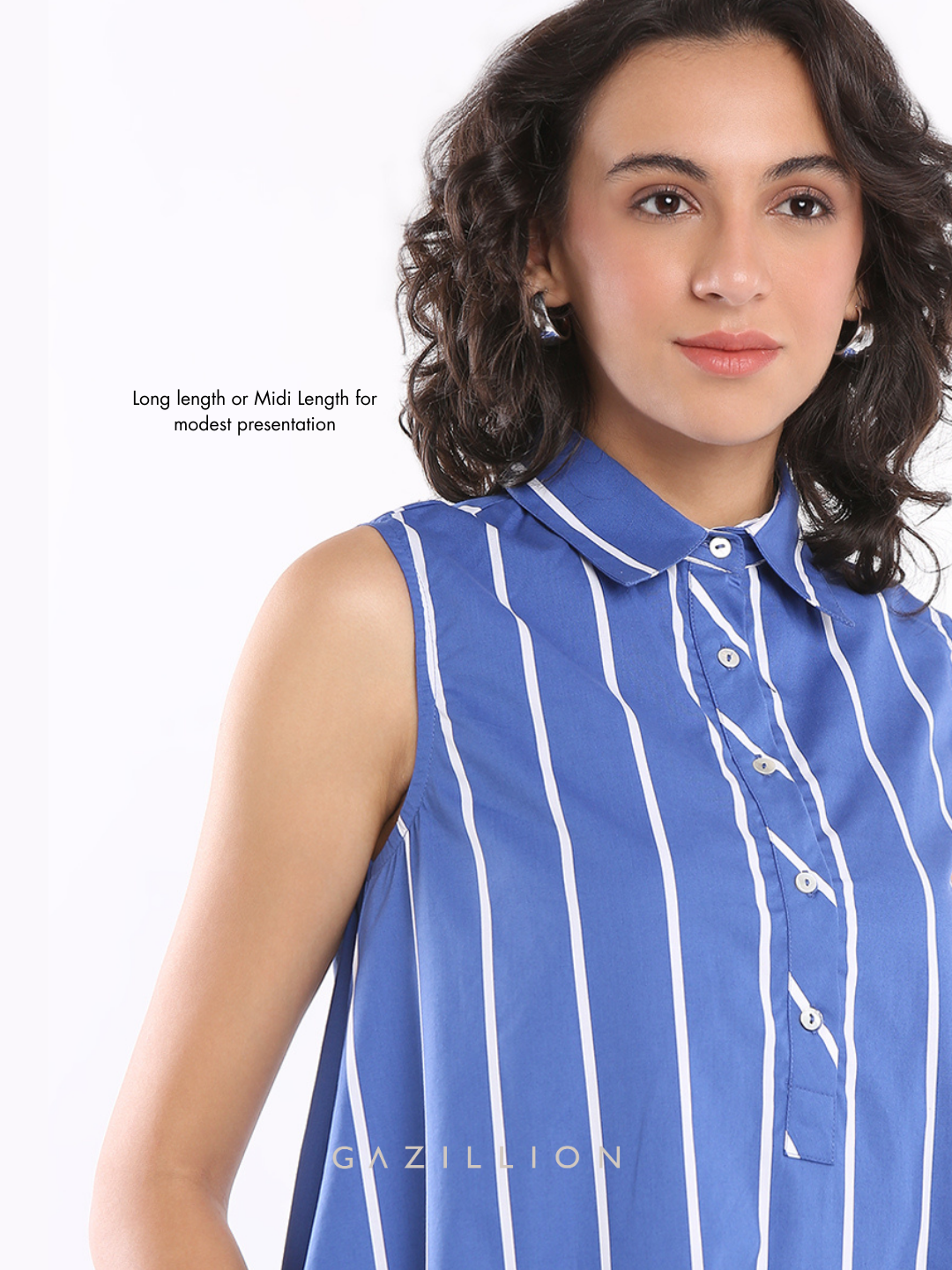 The Elva Blue & White Stripes Cotton Midi Dress is your go-to choice for the perfect casual work-wear or comfortable formal wear dress. You can wear this A-line cotton dress all day long with complete ease. You can style it up with a belt or keep it loose and breezy for an activity-packed day at your office.