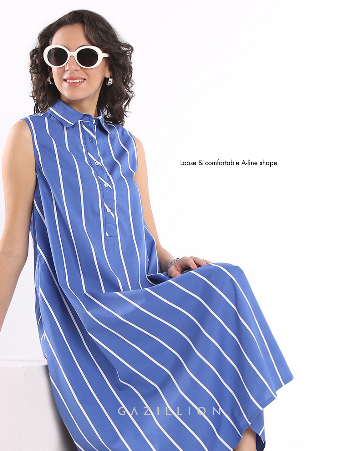 ELVA BLUE & WHITE STRIPES COTTON MIDI DRESS FOR WOMEN