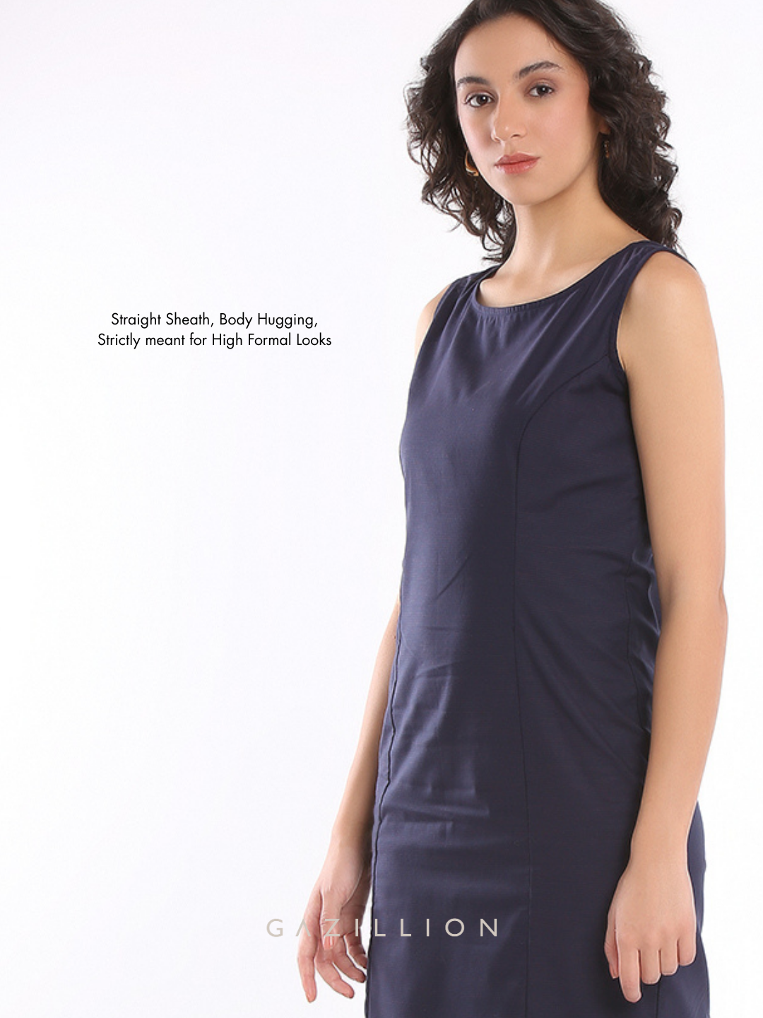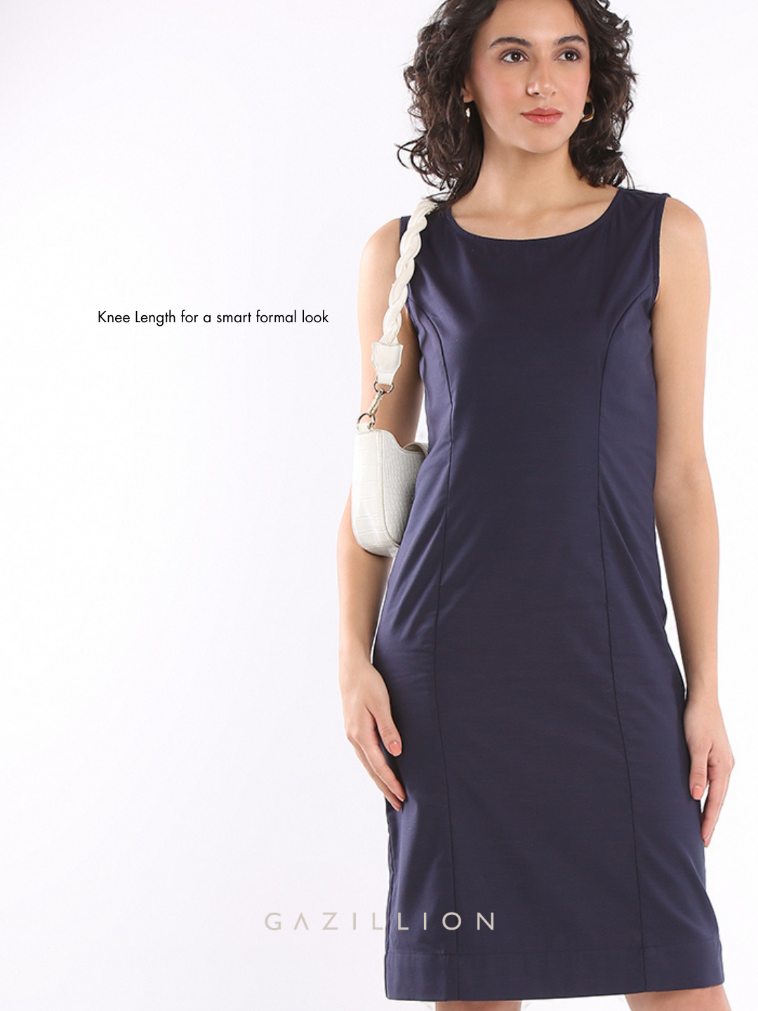 The Emilia Formal Sheath Dress is meant to give you an empowered vibe. The navy blue pin stripes are formal and no-nonsense. The fabric is a 100% cotton and makes the dress comfortable to wear to work all day long. The sheath dress fit is body hugging, sexy and boardroom ready. Wear it if you want to make an impression.