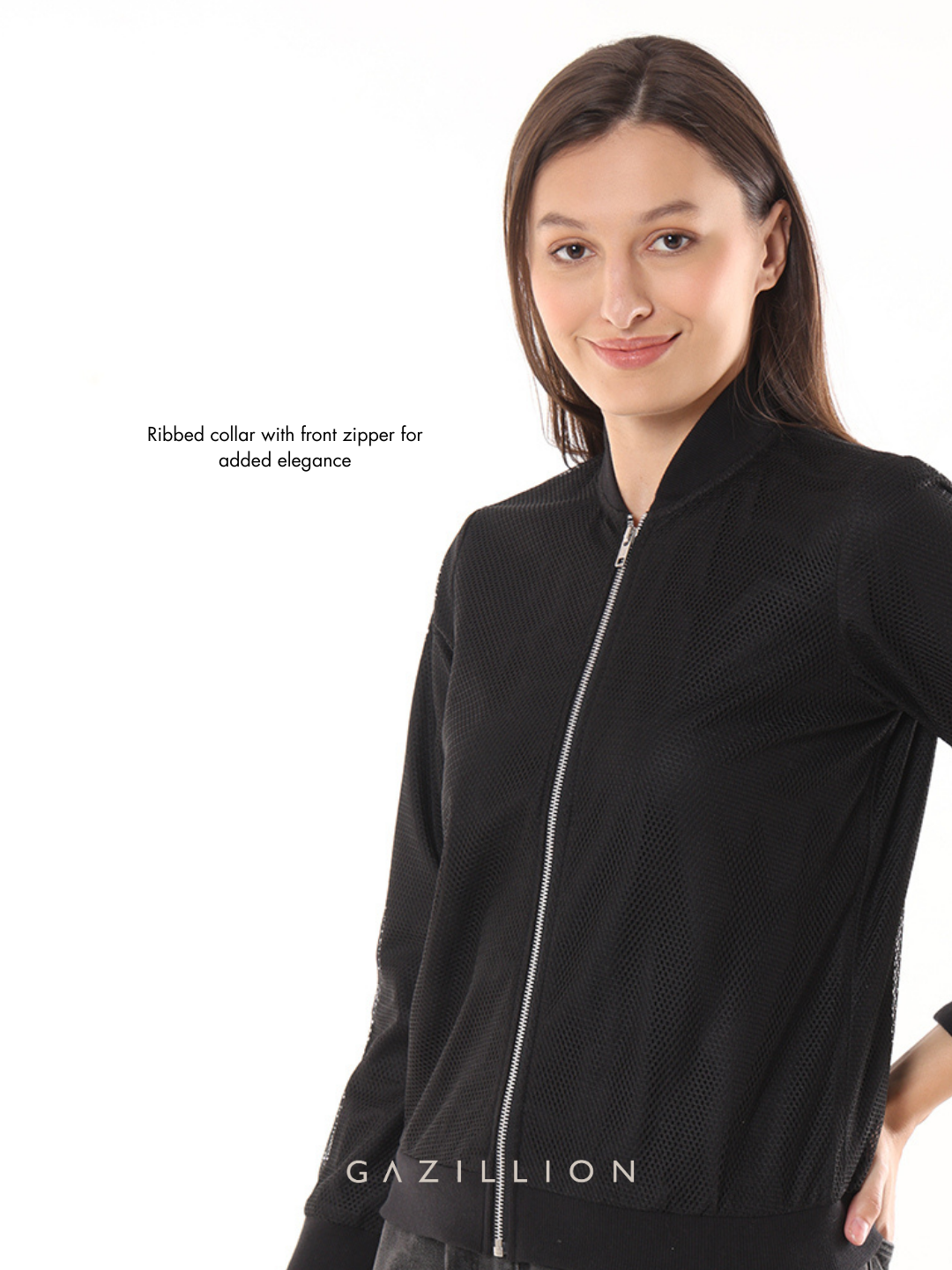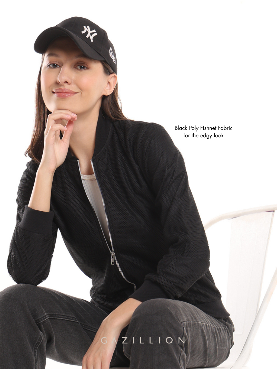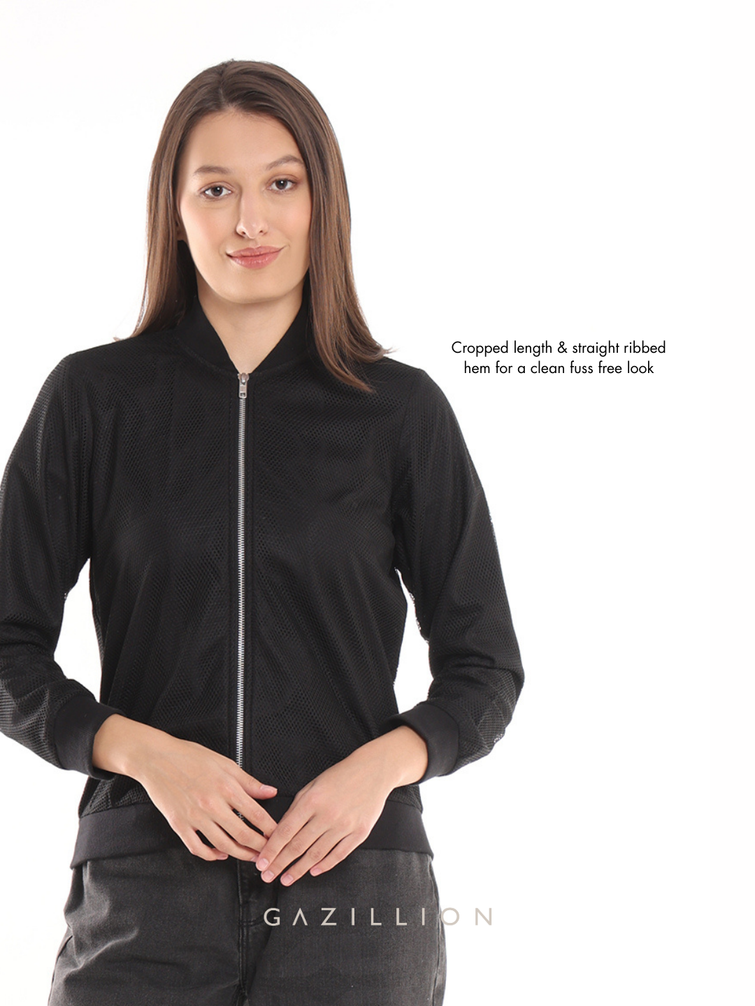 The Emryn Black Net Cropped Bomber Jacket redefines casual chic with its sleek net fabric and ribbed hem. Perfect for office casuals or laid-back fashion moments, this stylish jacket adds a touch of edginess to any outfit. When you wear it, you radiate effortless confidence and contemporary flair.