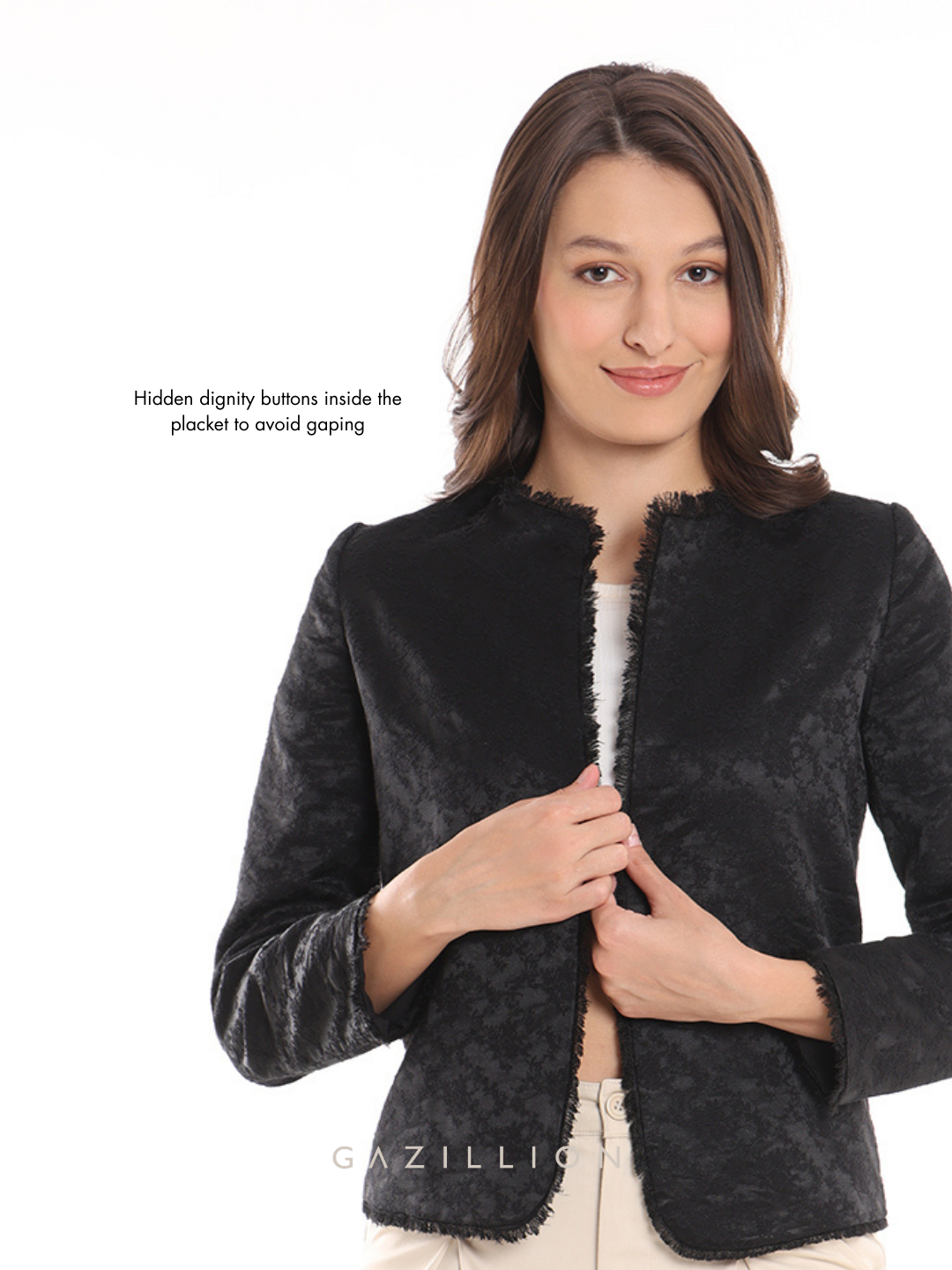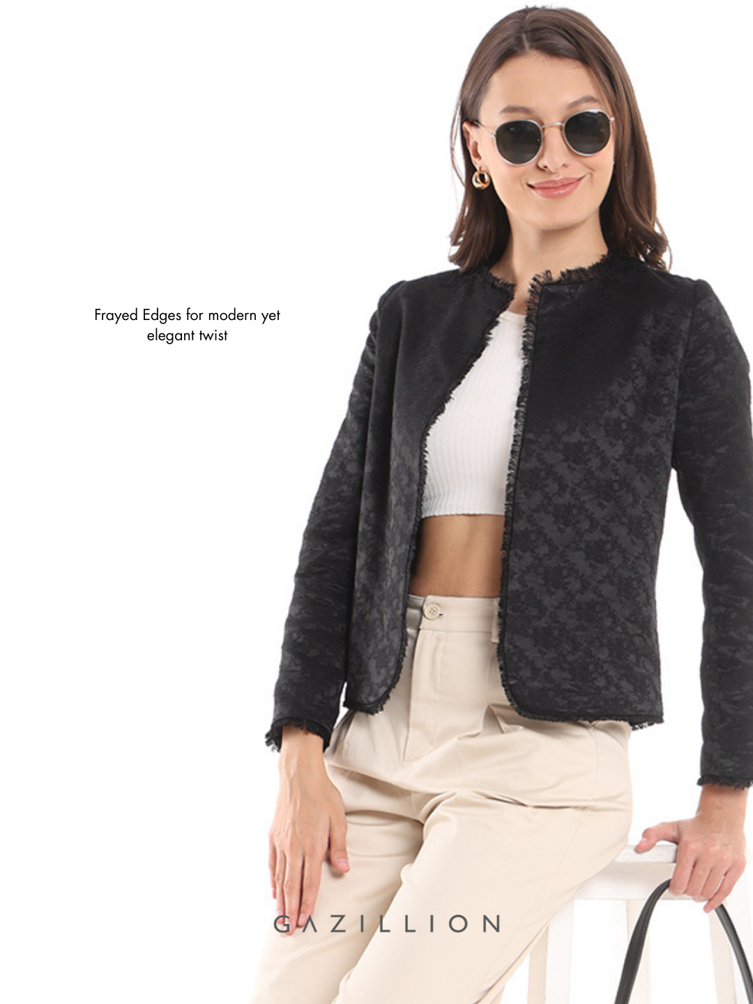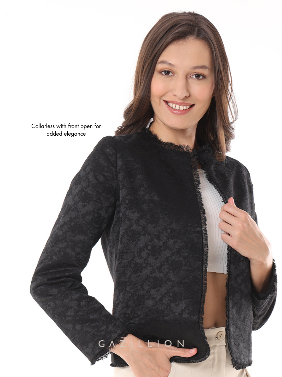 The Enid Black Jacquard Collarless Cropped Jacket radiate timeless elegance. Designed in a jacquard pattern fabric, its cropped, collarless silhouette makes it perfect for formal office settings or stylish workwear. When you wear it, you redefine formal fashion with a modern twist.