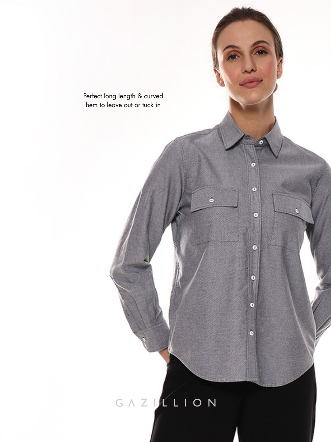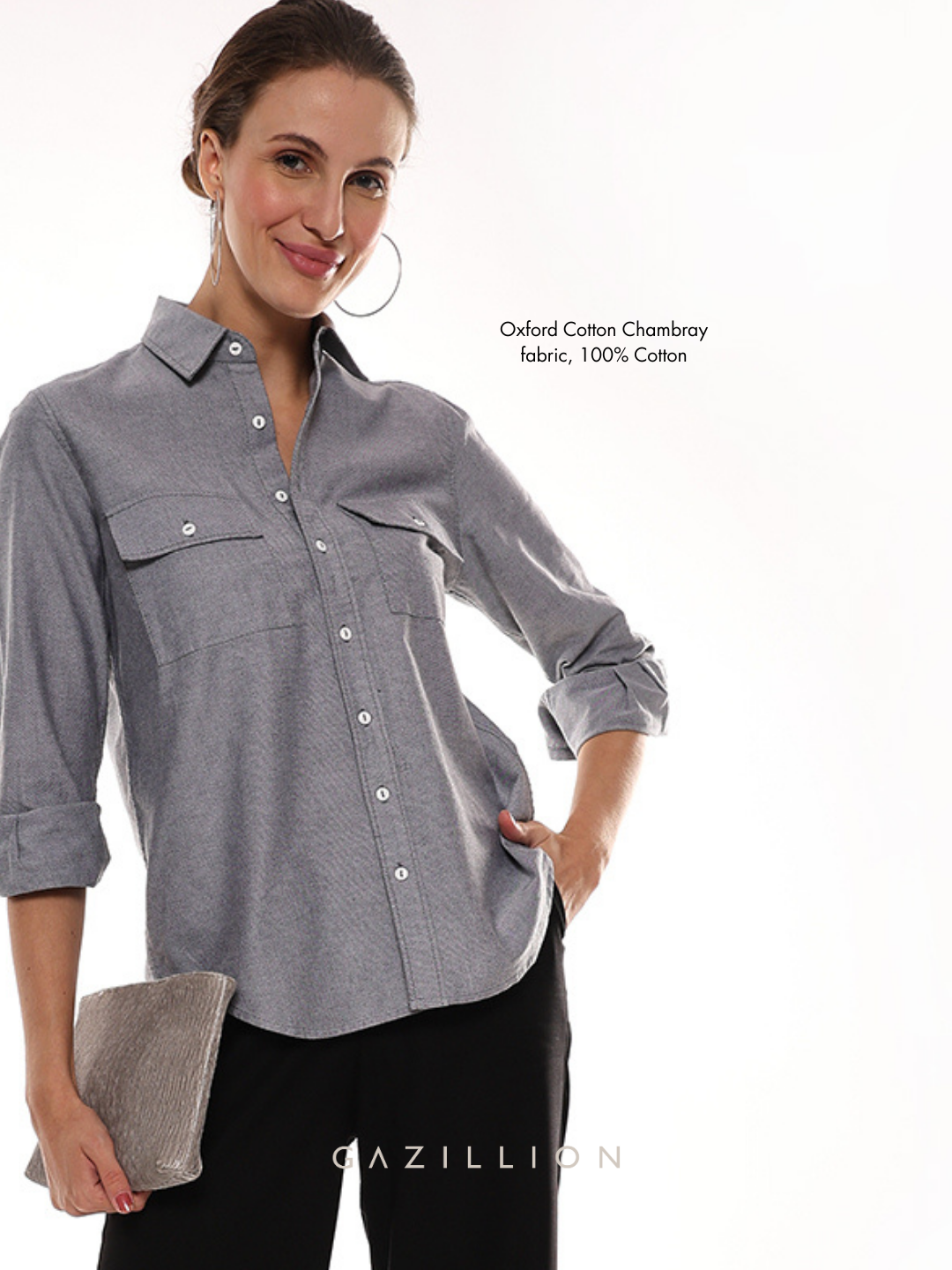 The Aura Cotton Shirt, is a classic women's utility shirt in Oxford Cotton Chambray fabric, will never go out of style. When you wear it, it redefines your stride, blending confidence with effortless charm.