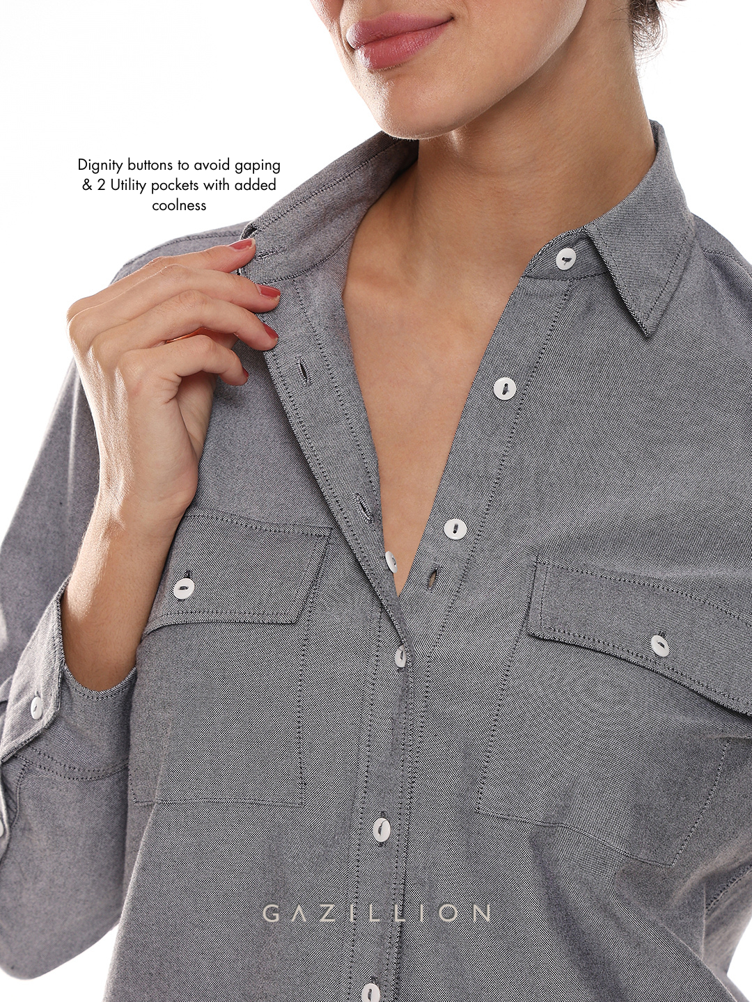 - Hidden dignity buttons inside the placket to avoid gaping