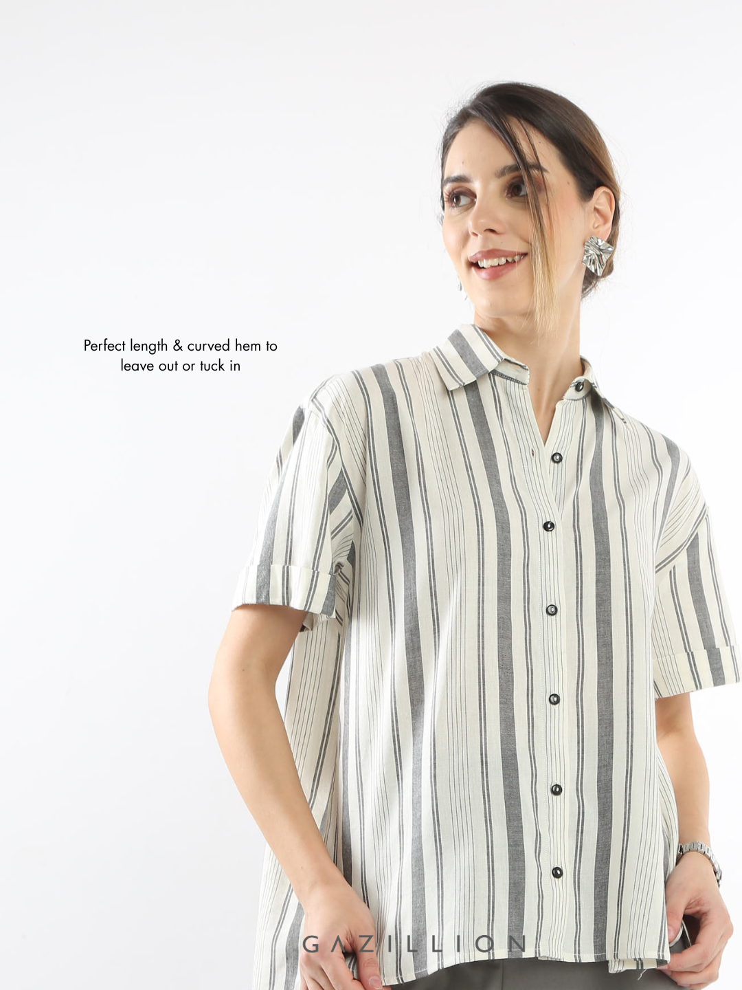 EDITH GREY STRIPES COTTON SHORT SLEEVES SHIRT FOR WOMEN