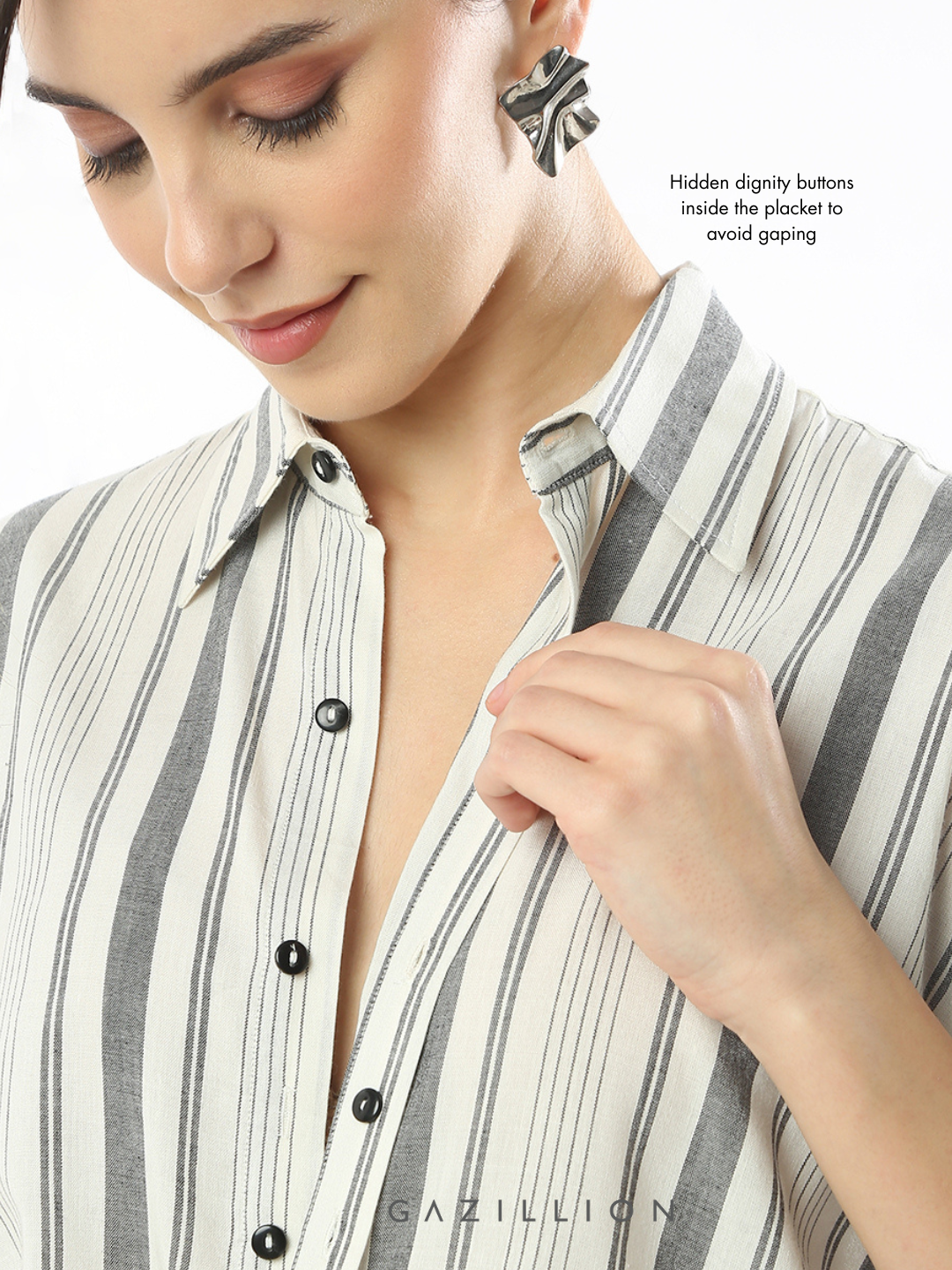- Hidden dignity buttons inside the placket to avoid gaping