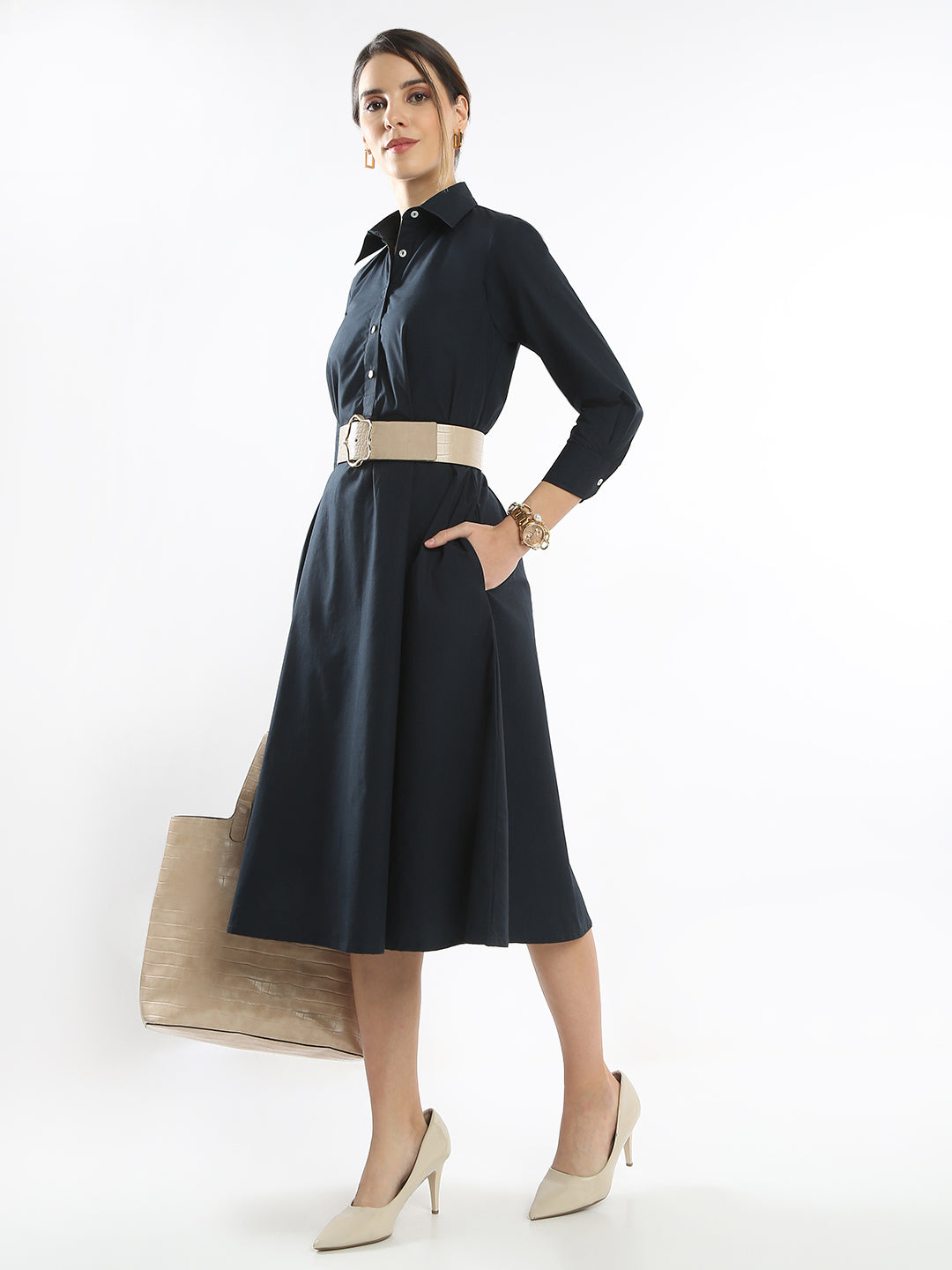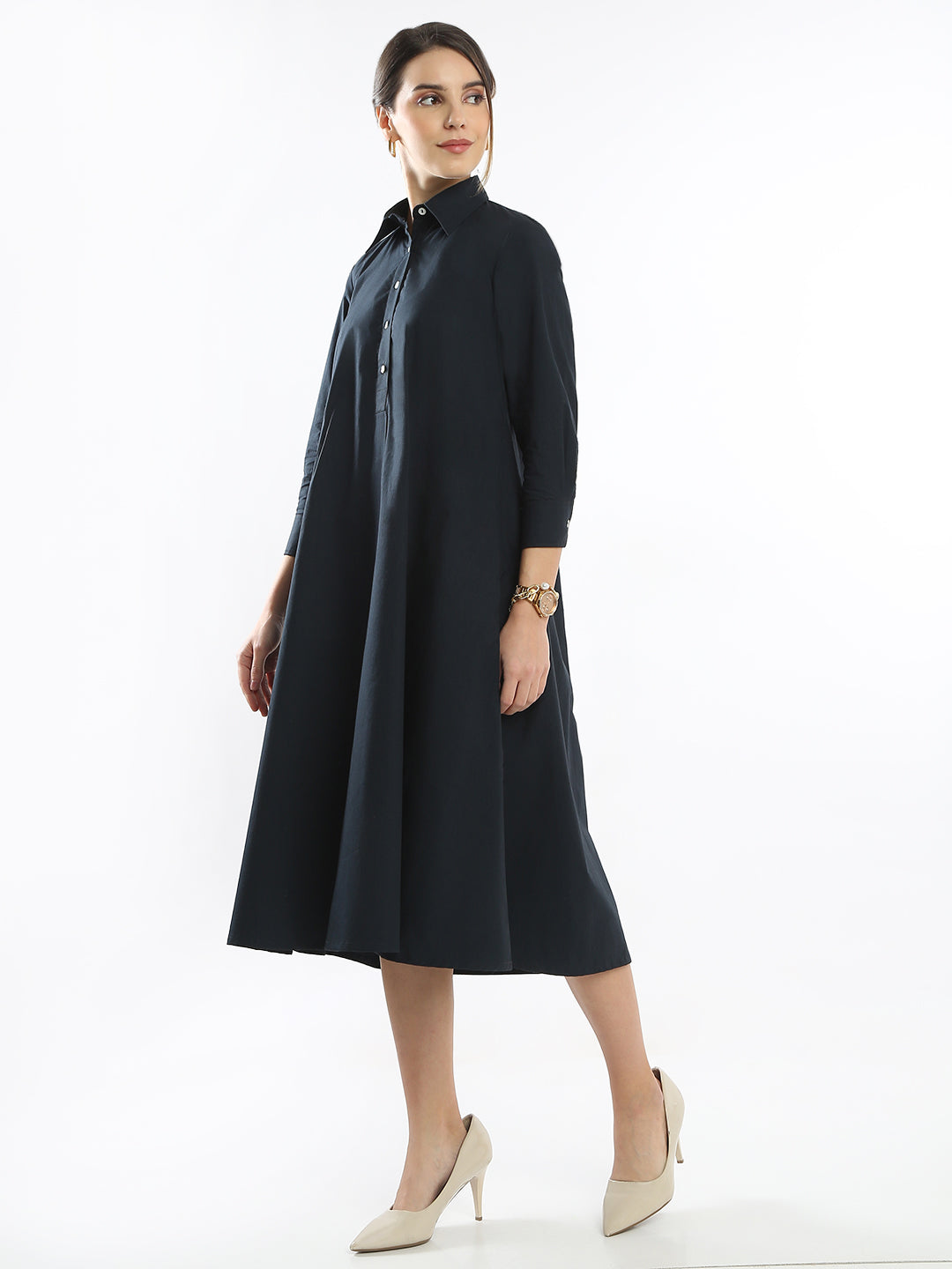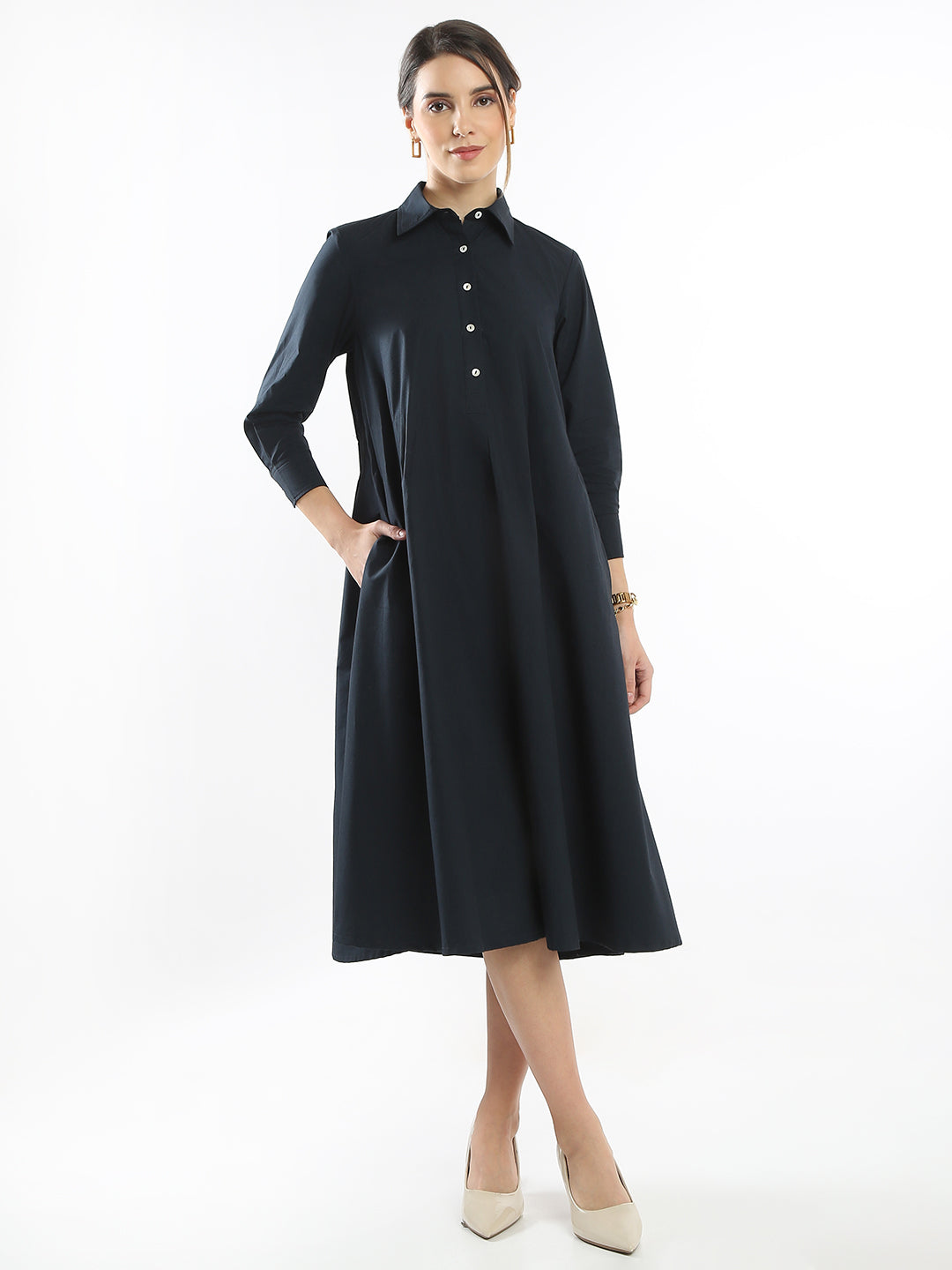 The Elinda Black Cotton Formal Midi Dress is your go-to choice for the perfect work-wear or formal wear dress. You can wear this comfortable cotton dress all day long with complete ease. You can style it up with a belt or keep it loose and breezy for an activity-packed day at your office.
