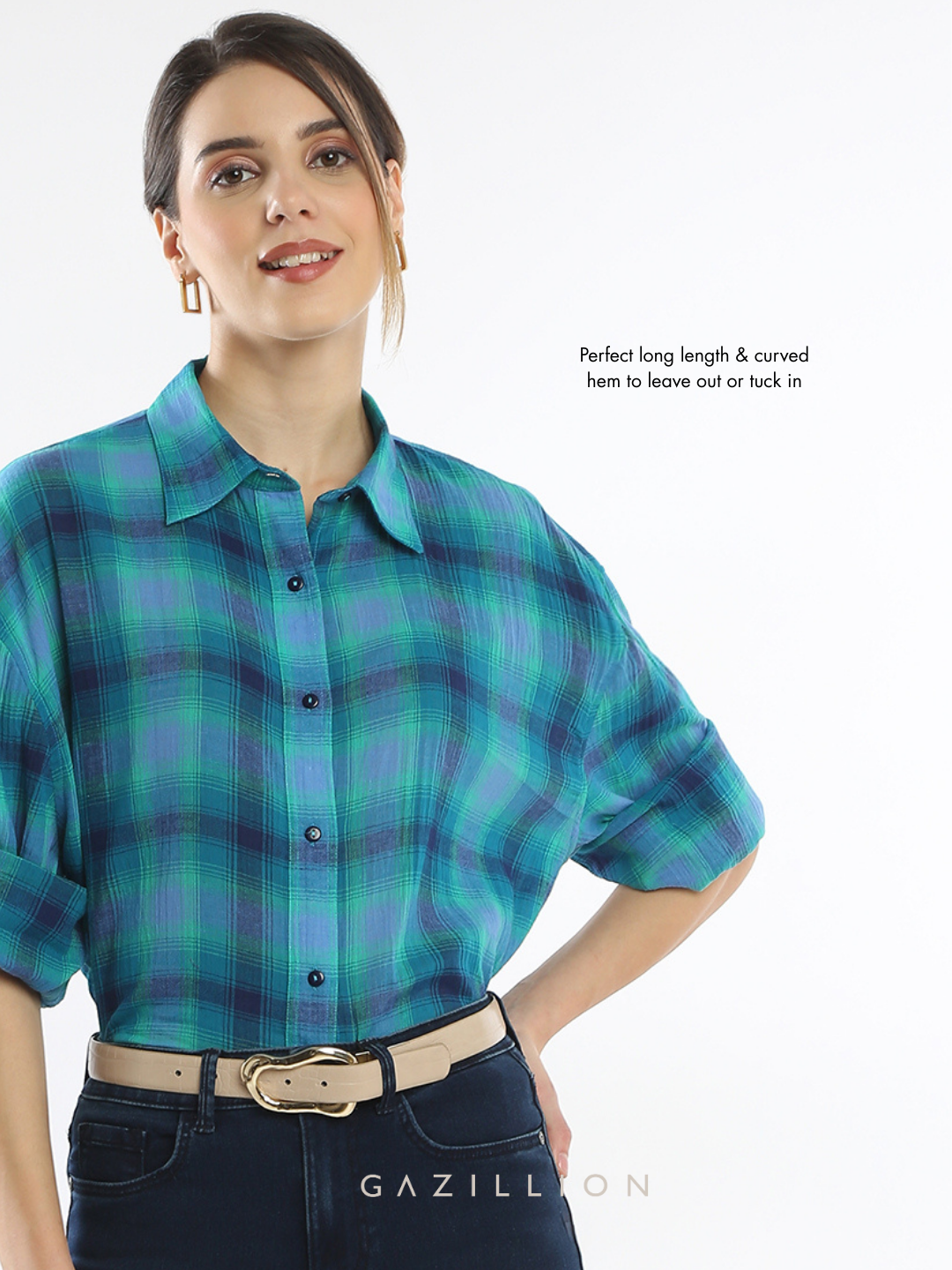 The Ella Blue Checks Cotton Oversized Shirt is a timeless blend of comfort and style. Made from soft cotton with a classic blue checks pattern, wearing it transforms your stride, radiating confidence and inviting admiration.