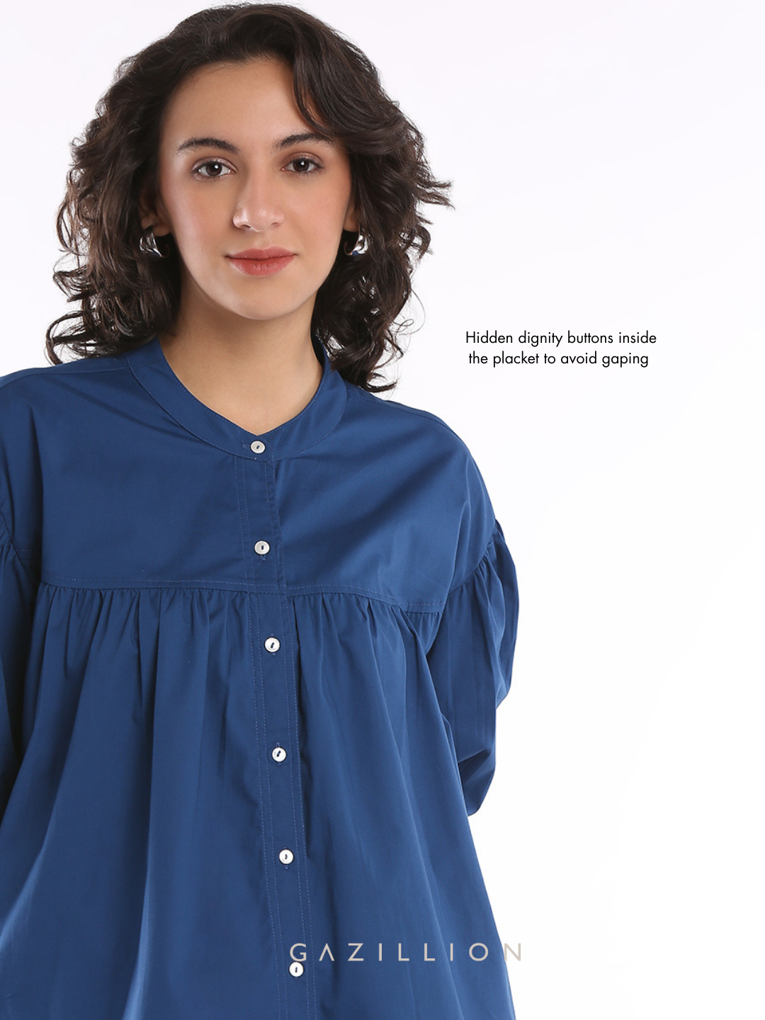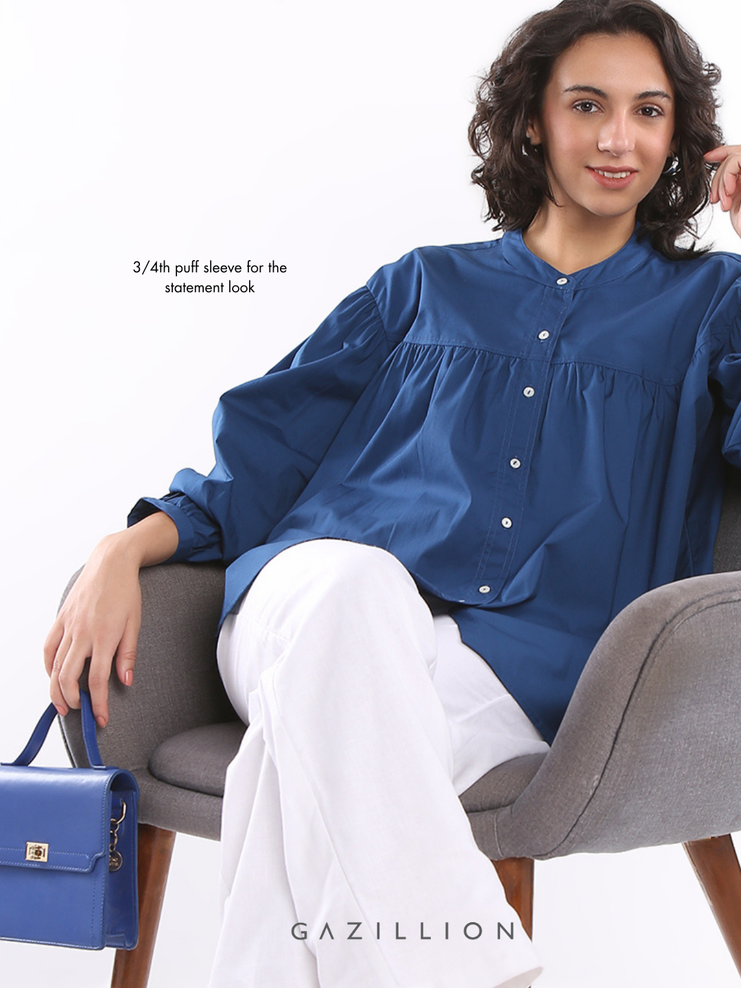 Oh the beautiful gathers of this shirt! The Ellie shirt is the most elegant and stylish shirt that you will have in your wardrobe and your go to choice for office-wear or work-wear. The soft cotton is very comfortable and the gathers make this shirt breezy and great for a day packed with activity. Wear it with white pants or jeans for a airport ready look.