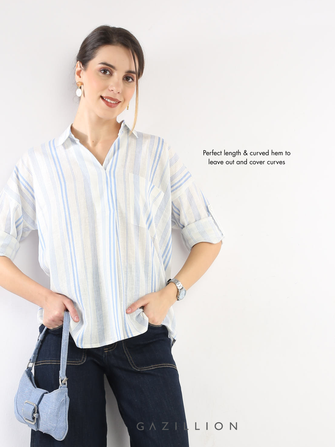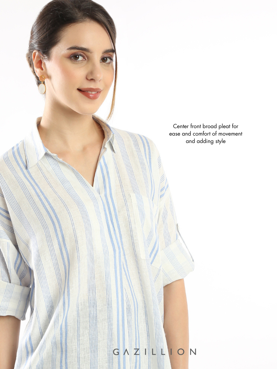 The Erin Blue & White Stripes Pullover Shirt blends elegance with comfort, making it a versatile work-wear wardrobe essential. Crafted from soft, breathable cotton, its relaxed silhouette flatters all body types, while the blue stripes add a subtle, sophisticated touch. The shirt can be pulled on or taken out with ease and the all round looseness makes sure you will be comfortable through the day.