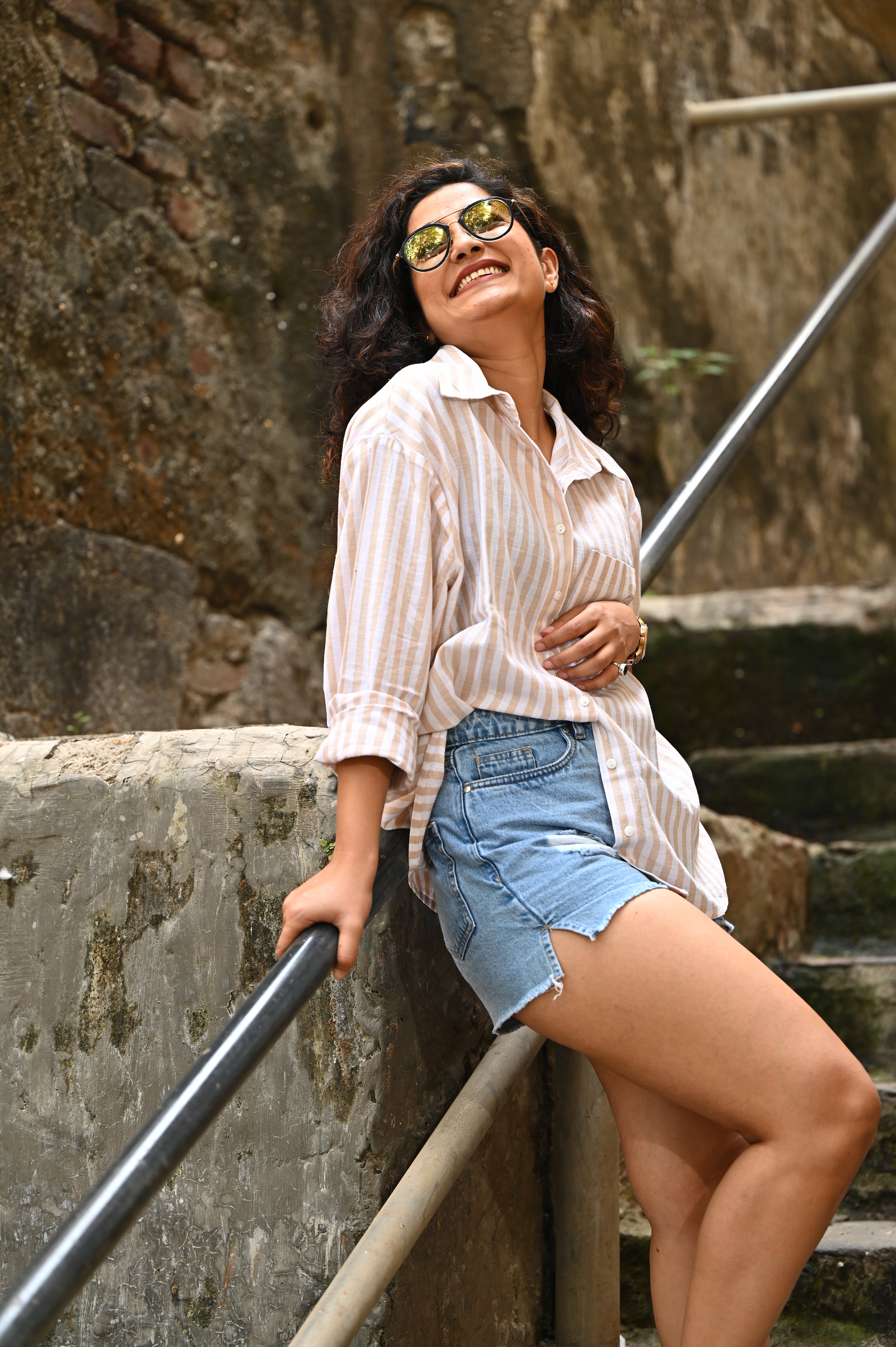 AMANDA BEIGE & WHITE STRIPED OVERSIZED COTTON SHIRT FOR WOMEN