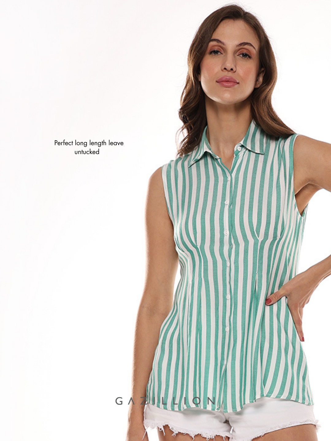 ANIKA GREEN & WHITE STRIPED SLEEVELESS SHIRT FOR WOMEN