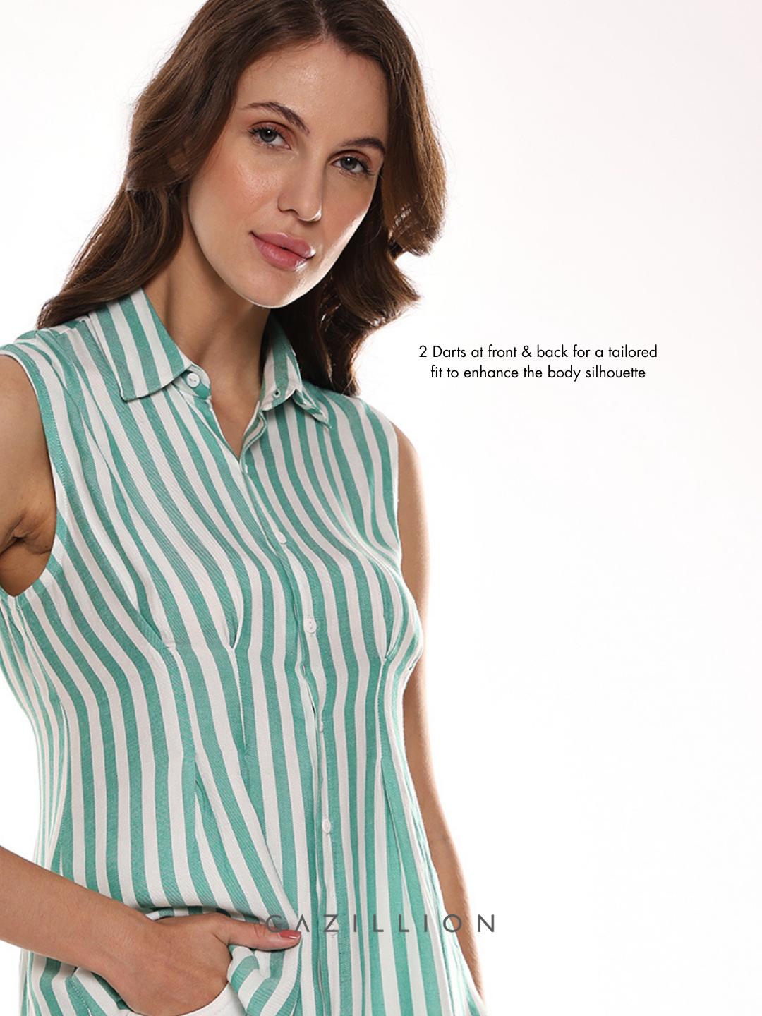 The Anika Green & White Striped Sleeveless Cotton Formal Shirt is a perfect choice for a professional and comfortable look. Designed with double darts for a tailored fit, its long silhouette make it an elegant choice for office wear, ensuring you stay & feel stylish all day long.