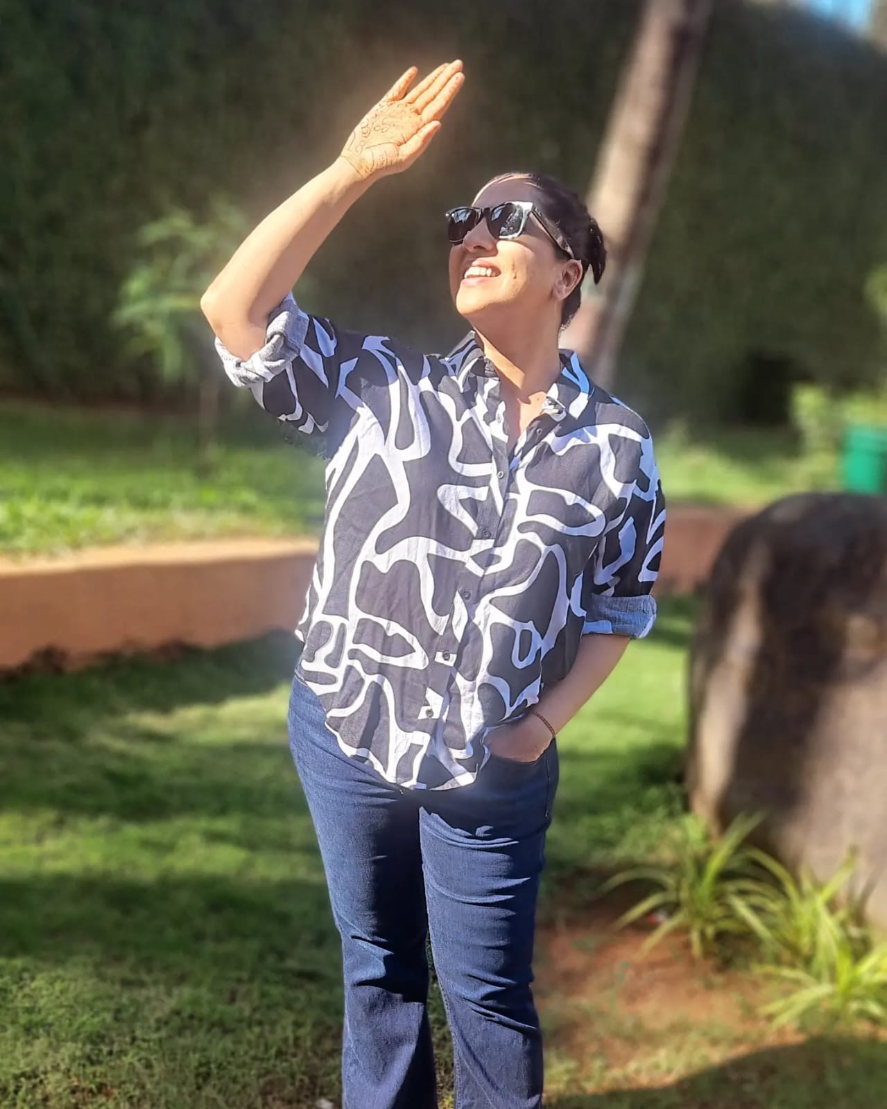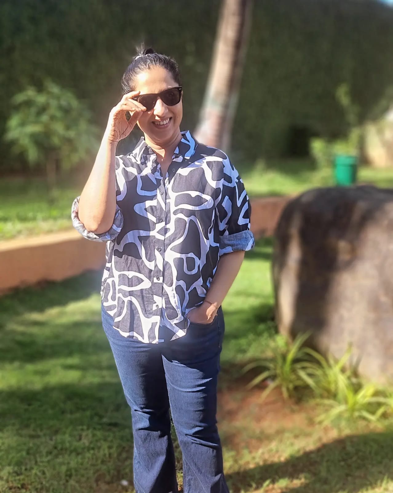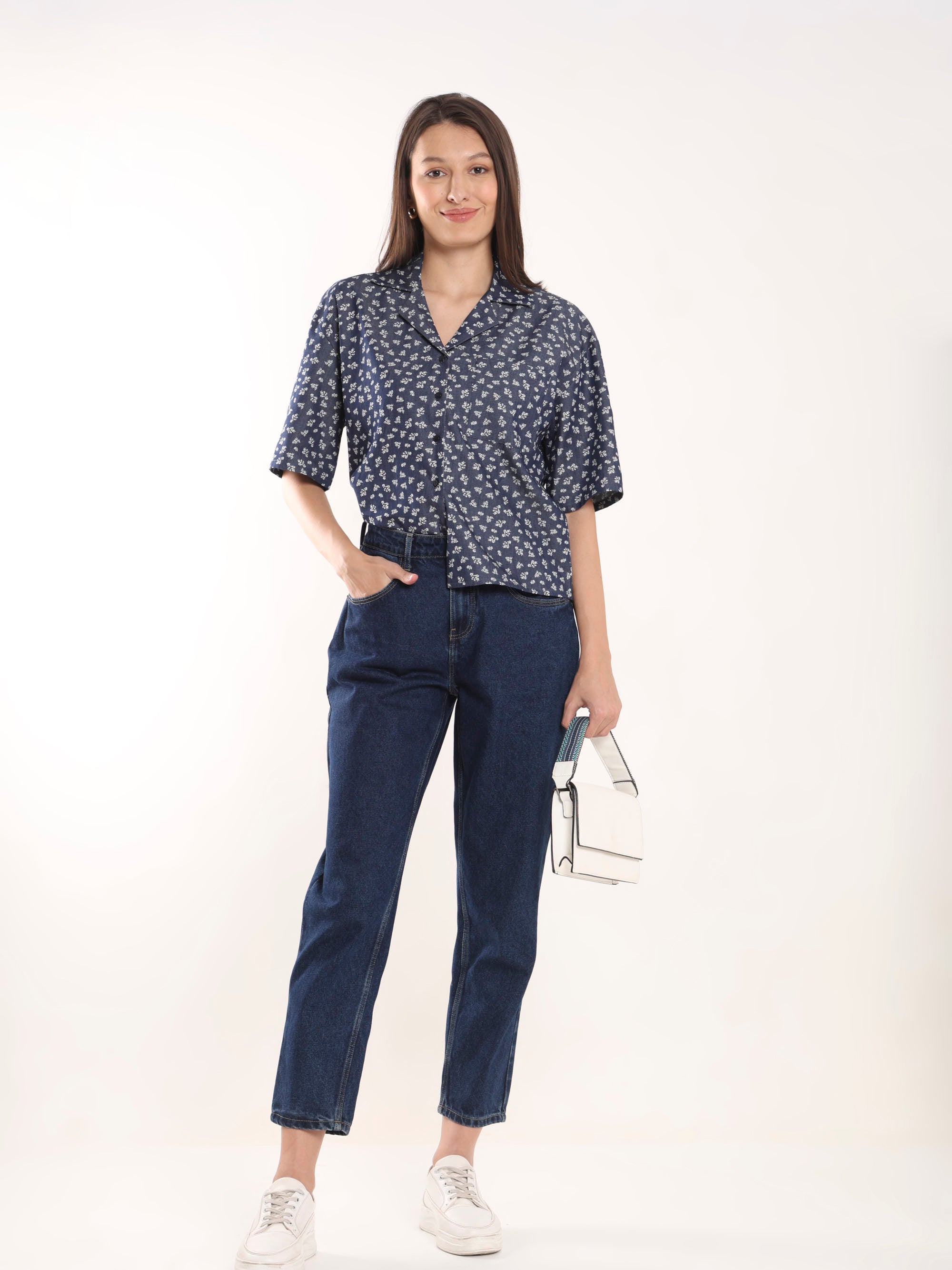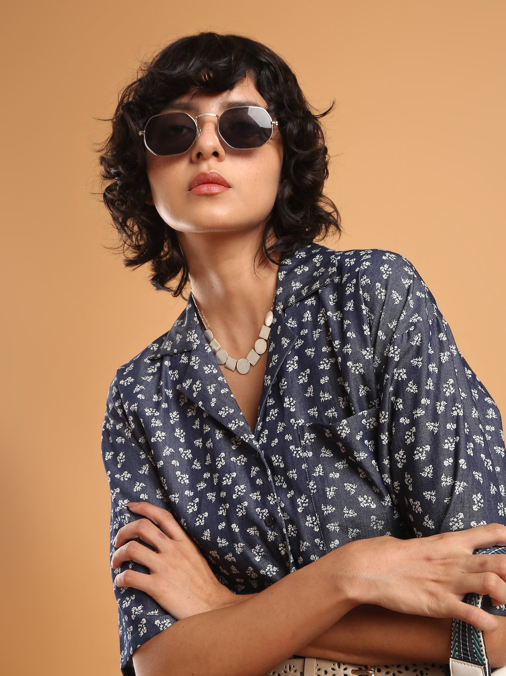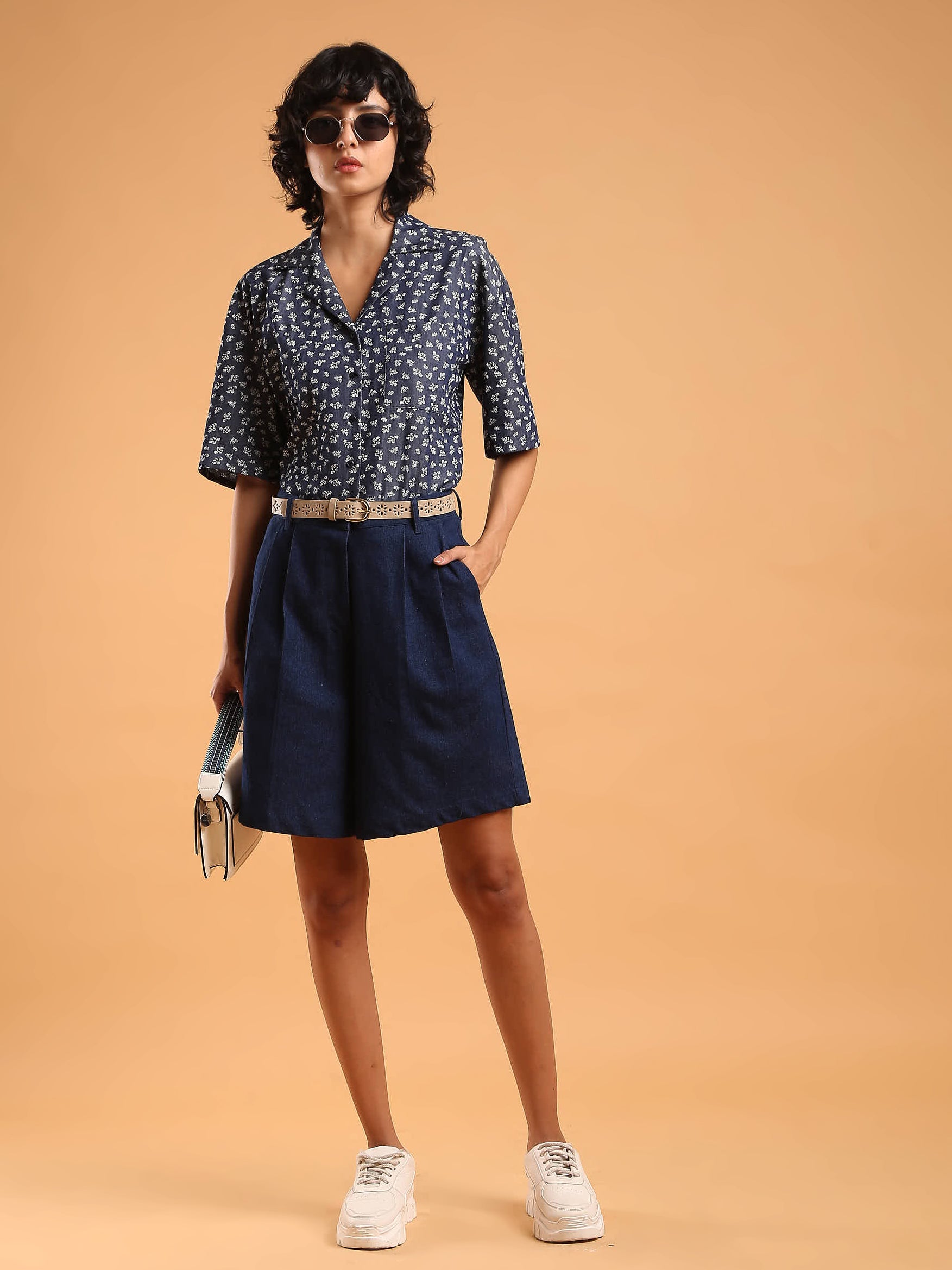 Cece Indigo Printed Short Sleeves Cropped Cotton Shirt