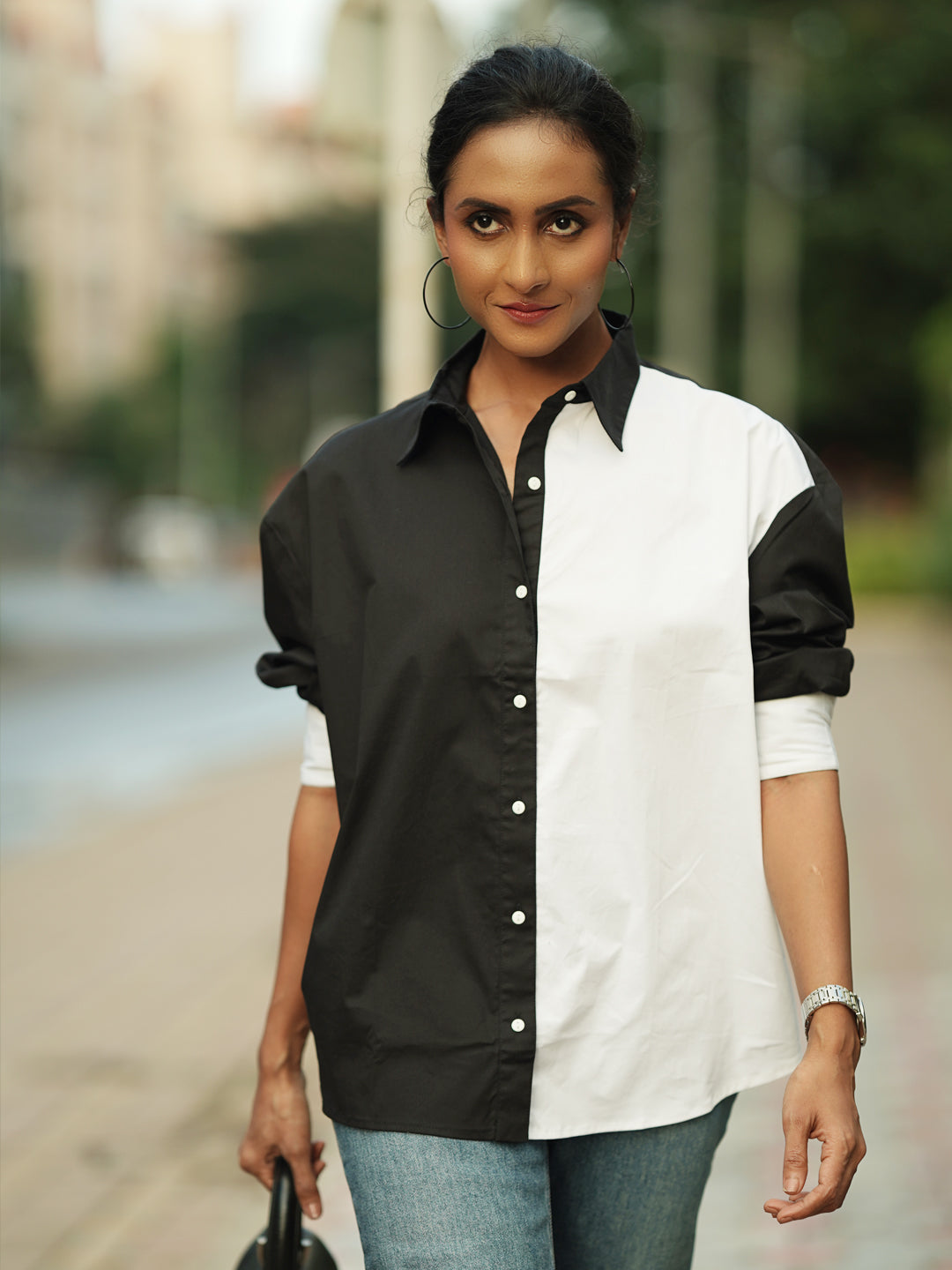 The Dana Black & White Colour Blocked Cotton Shirt is an oversized, casual fashion statement in timeless black and white. Made from soft cotton, this full-sleeve shirt brings a bold twist to your everyday wardrobe. When you wear it, the colour blocking and the oversized fit speaks—effortlessly chic, effortlessly you.