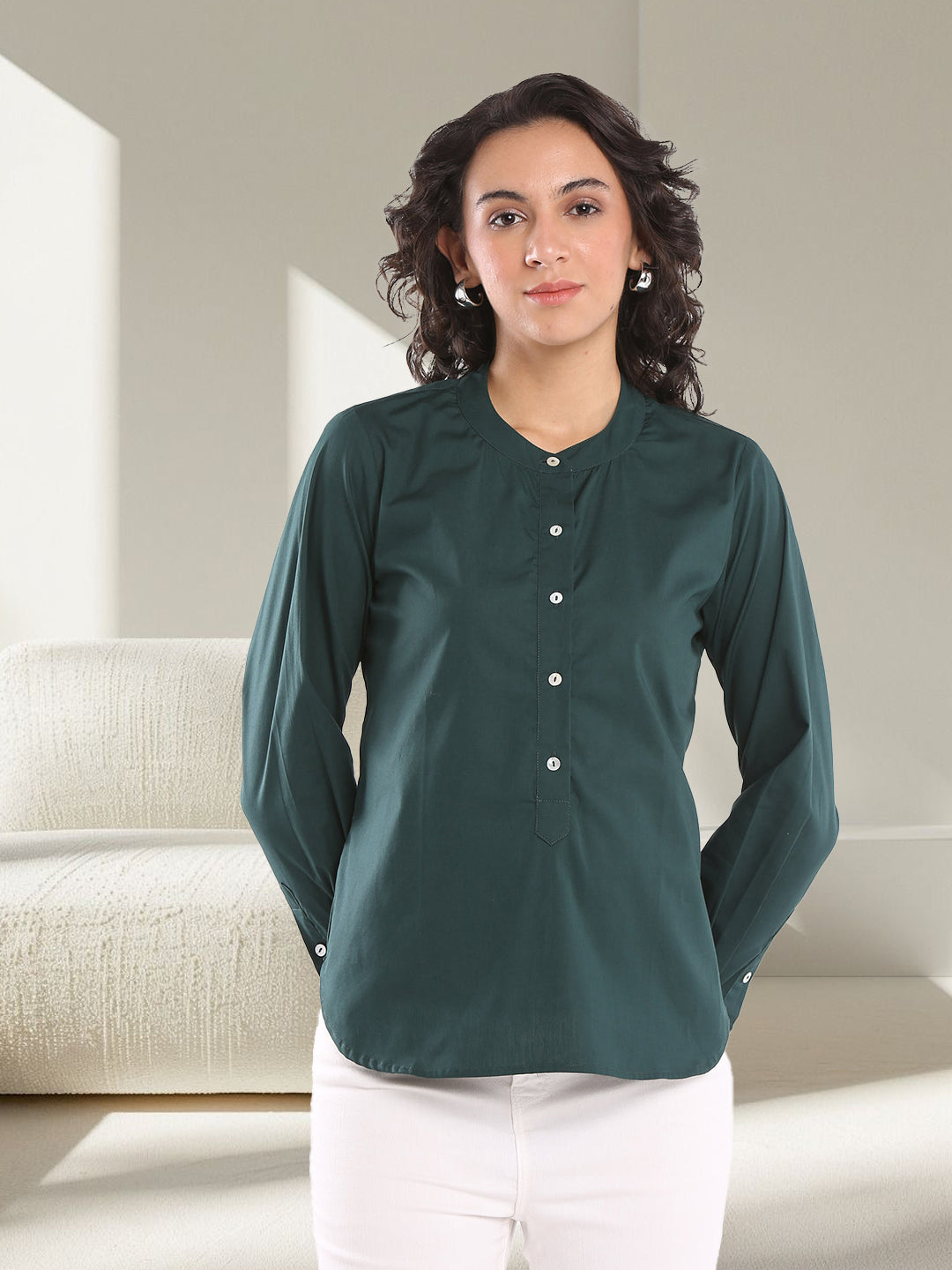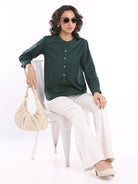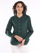 With Band Collar and Half Placket details, the Evana Office Shirt is the contemporary take on formal or office wear that today's women prefer. It is smart, chic, elegant and yet very relaxed and easy to carry all day long. You can wear it with trousers for a formal look or with jeans for a casual look.